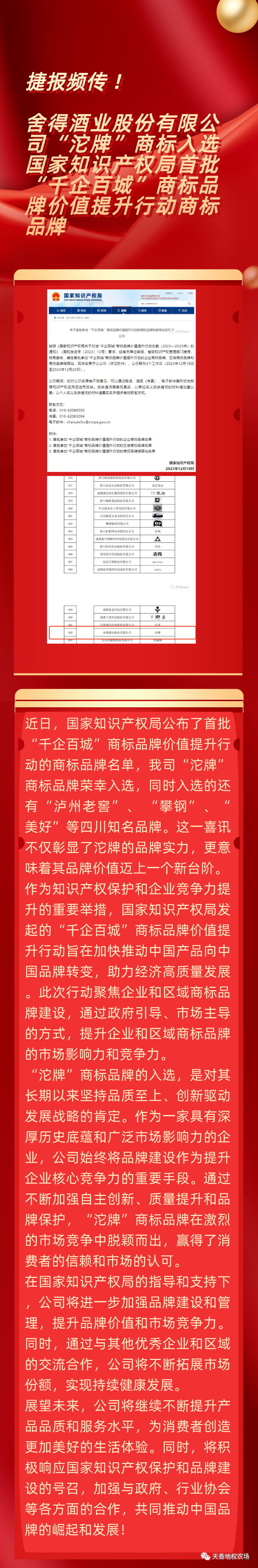 捷报:舍得酒业“沱牌”商标入选国家知识产权局,首批“千企百城”商标品牌价值提升行动商标品牌