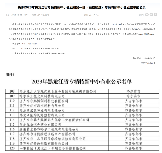 11月18日,蒙东(众荣农机)区域农服中心顺利通过黑龙江省工信厅审核,荣获黑龙江省“专精特新”企业认证。