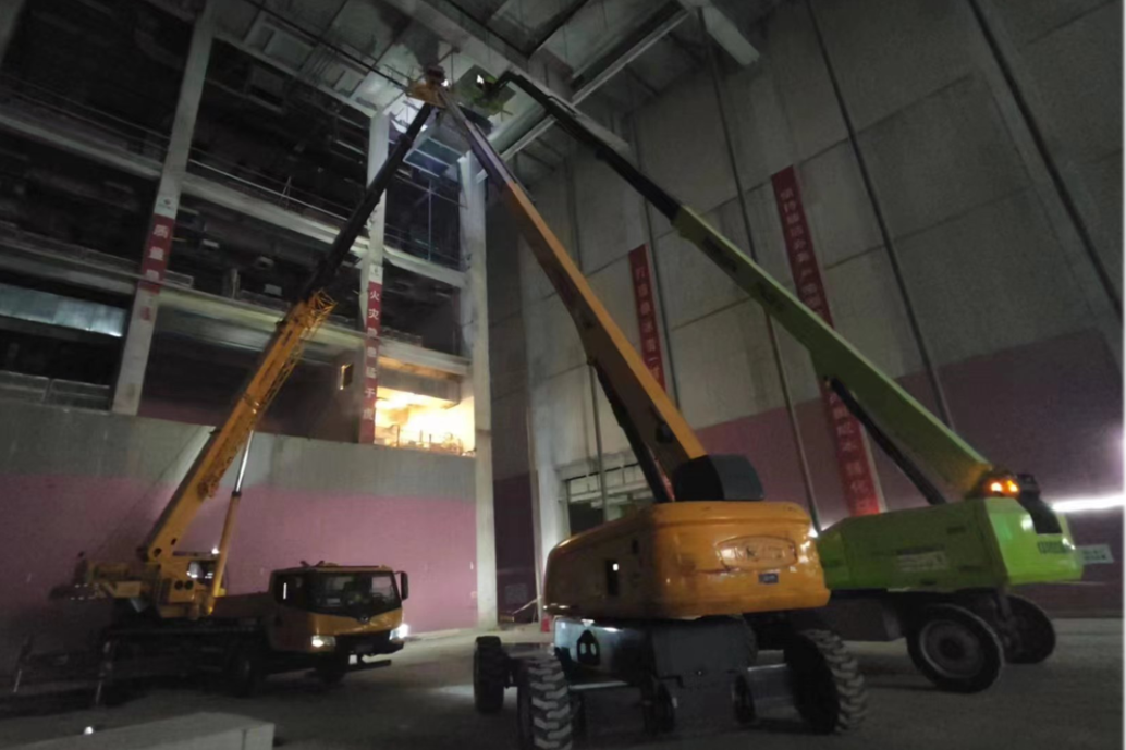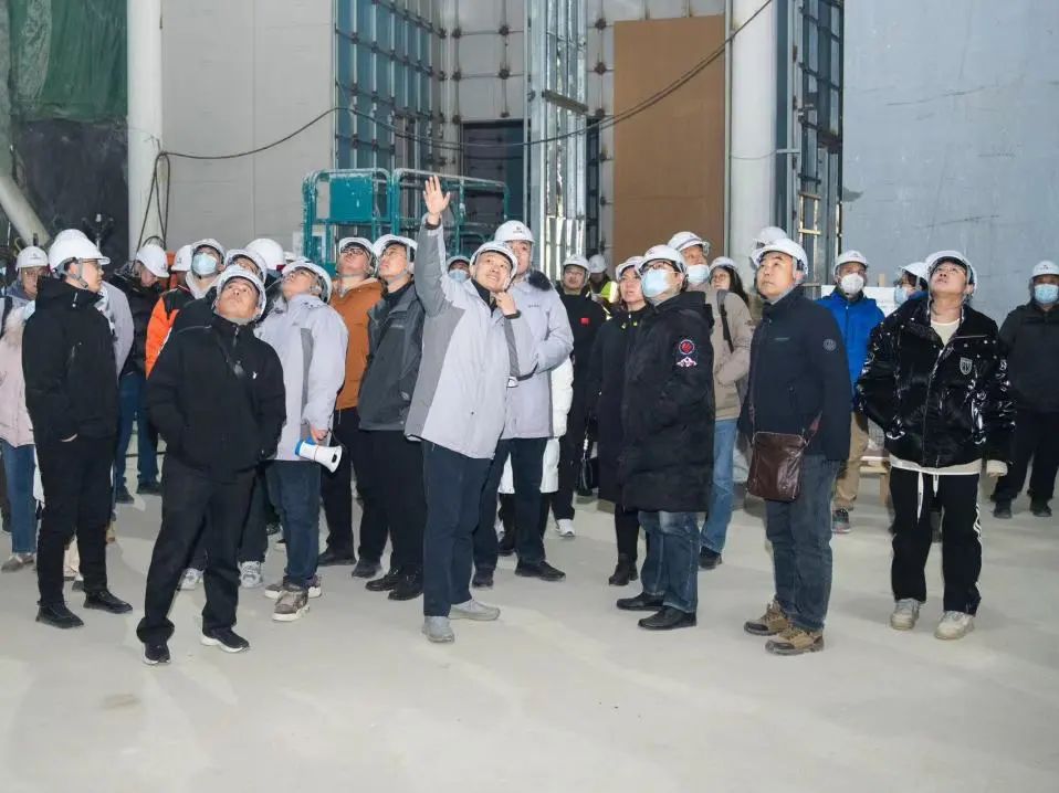 会后,全体参会人员到施工现场对超30米高空机电管线设备安装,截面长边超8米的超大风管吊装,圆形场地高空超大截面环形风管拼装,1.2米直径超大尺寸管道排布安装等技术进行实地观摩。