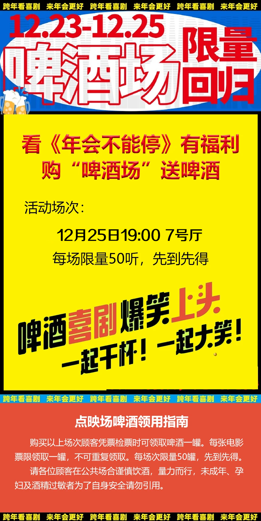 每场活动场,凭有效电影票检票进场前领取一罐啤酒,