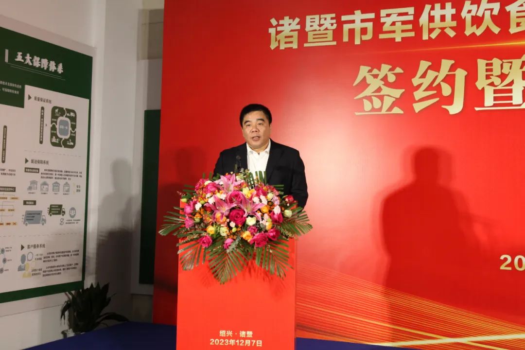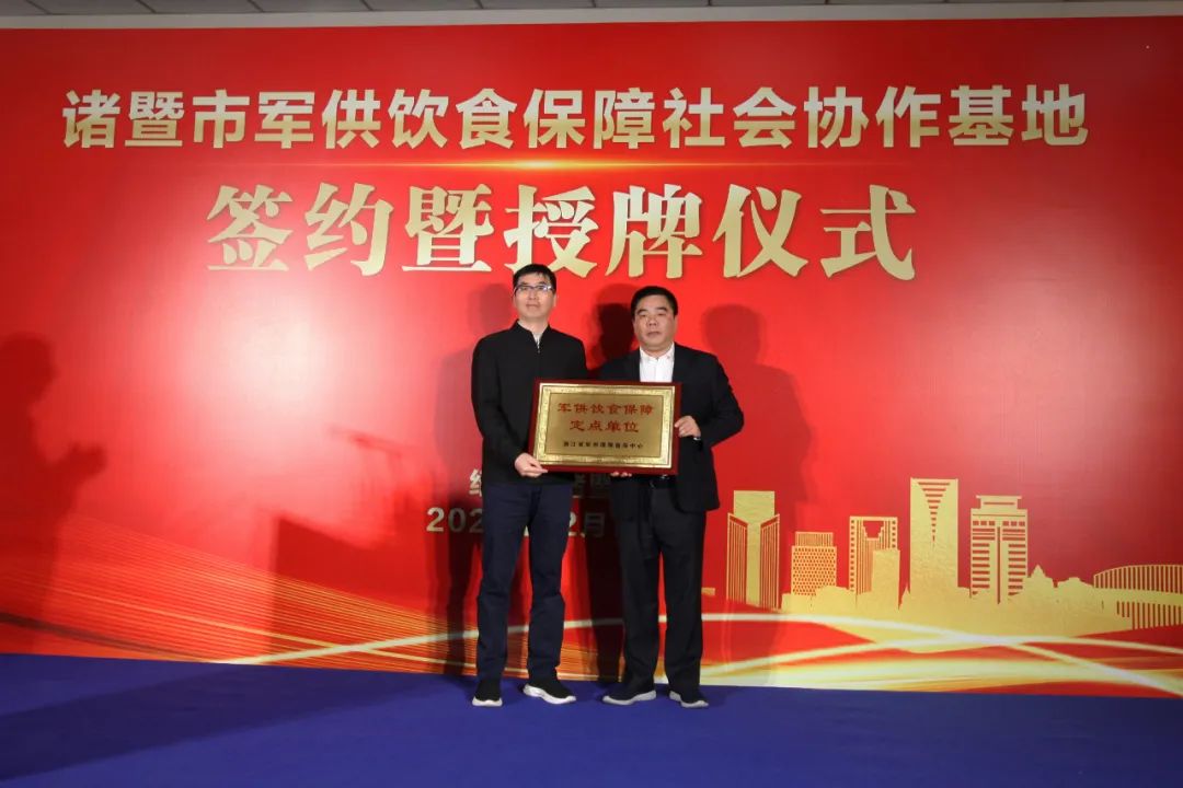 省军供站何铁峰主任为协会副会长单位浙江浙农茂阳农产品配送有限公司颁授军供饮食保障社会协作基地牌匾,浙农控股集团总经理助理、浙农茂阳董事长陈江接牌,标志着浙农茂阳成为诸暨市首个省军供饮食保障社会协作基地。