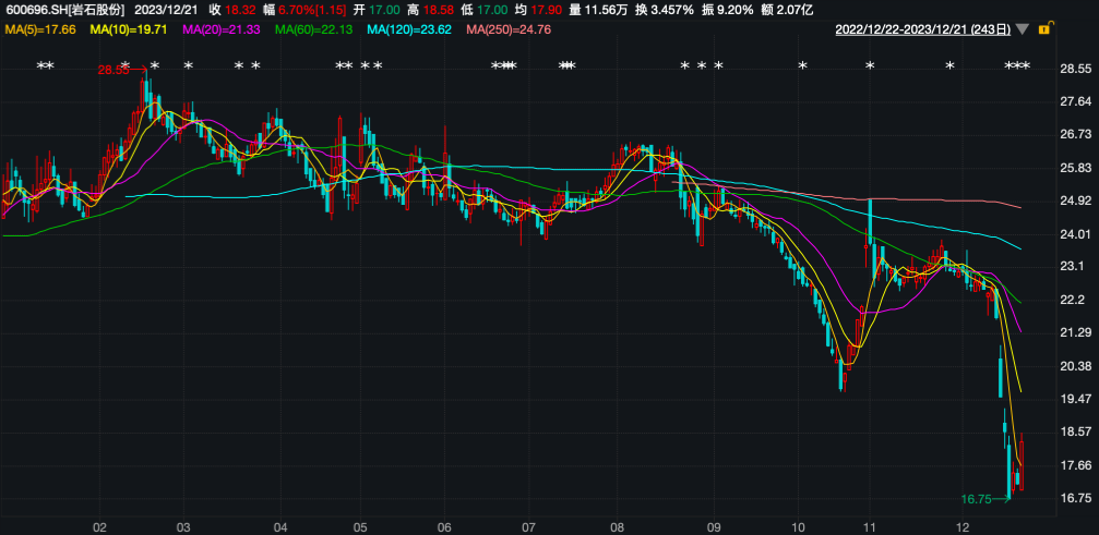 最近几个工作日,上海贵酒股份有限公司(下称岩石股份,600696.SH)股价大跳水。