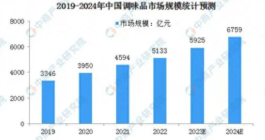 据中商产业研究院发布的《2024-2029年中国调味品行业发展分析与前景趋势研究报告》显示,2022年中国调味品行业市场规模达5133亿元,同比增长11.7%。若以餐饮行业占比60%计算,调味品行业来自餐饮行业的规模将达到3079.8亿元,占同期餐饮行业收入的7%左右。