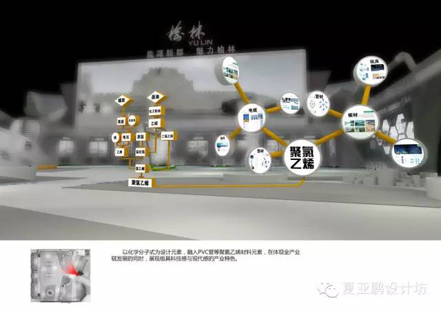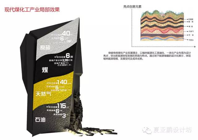 本方案重点表现的是五大产业的协同发展,通过艺术化的立体造型,构成现代写意实景,以科技元素的艺术化运用,呈现榆林产业创新、科技创新的亮点所在,突显相关招商引资项目的规模与优势。