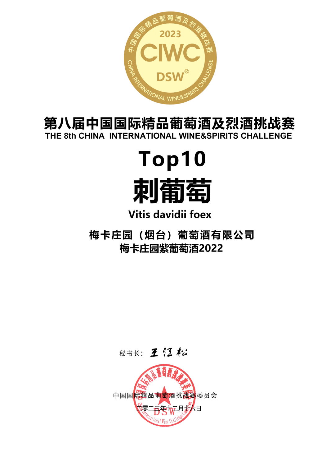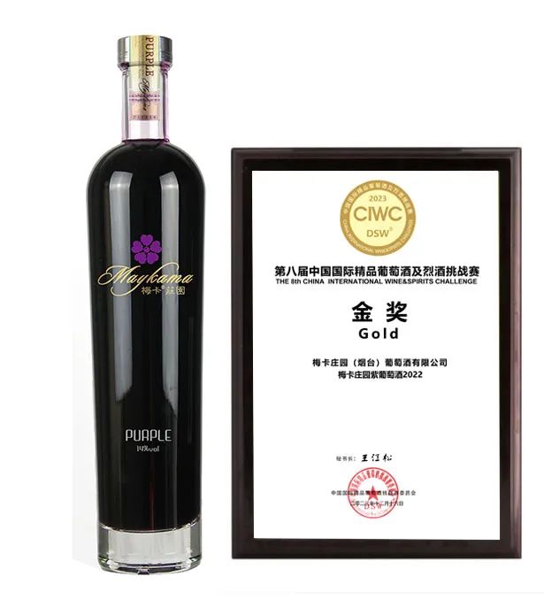 2023年12月16日,由中国国际精品葡萄酒及烈酒组委会(简称DSW)主办第八届中国国际精品葡萄酒及烈酒挑战赛(简称CIWC)在青岛举办,有来自全国20多位评委的盲品下,评出了干白组、干红、水果、蒸馏酒、加强型酒、威士忌等组别奖项。梅卡庄园紫葡萄酒在众多产品中脱颖而出,荣获第八届中国国际精品葡萄酒及烈酒挑战赛金奖。