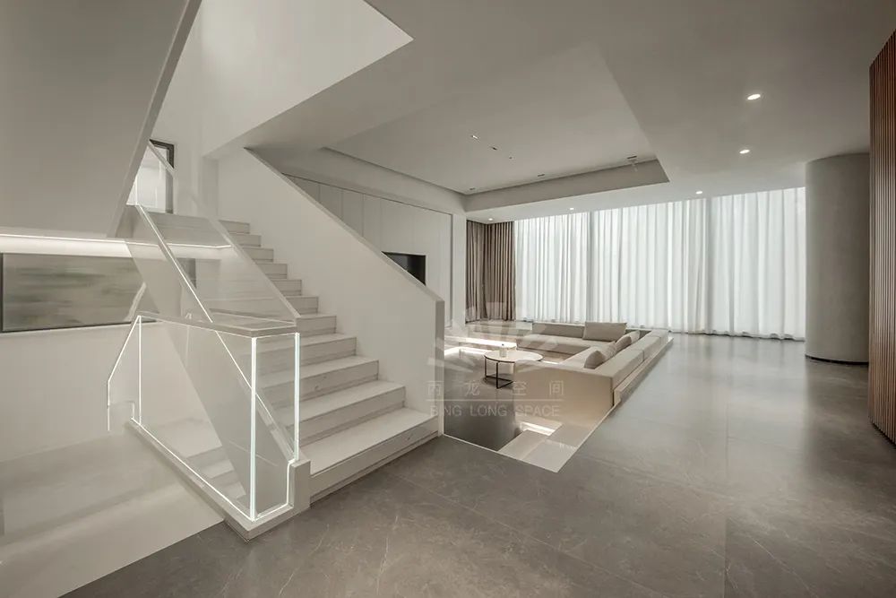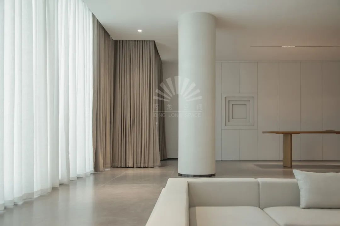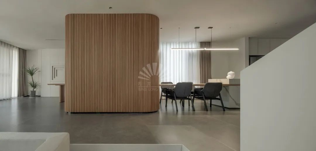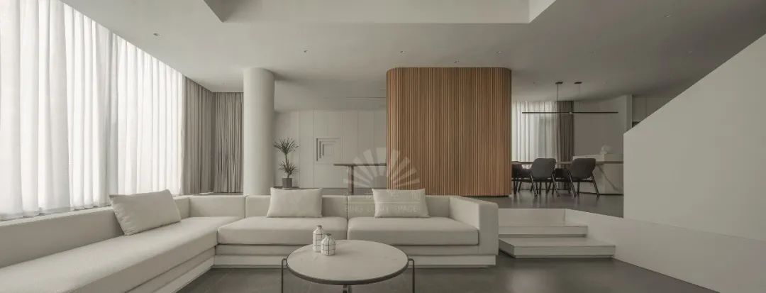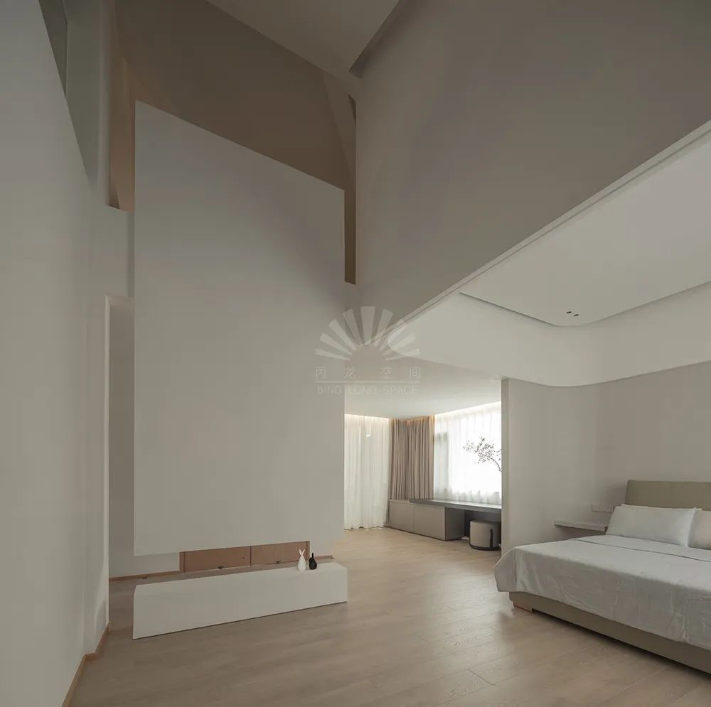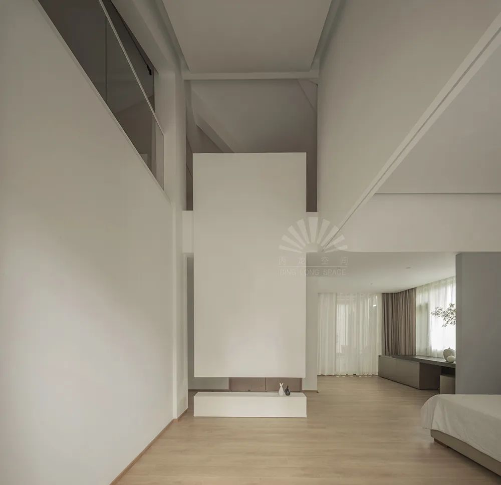 目前,2022第十八届设博会正在火热进行中,组委会将充分利用设博会、中装协环艺分会、新家网等官方网站和环球装饰设计、设博会等三个公众号及短视频新媒体矩阵,同时联合新浪家居、中装新网、腾讯家居、网易家居、凤凰家居等权威行业媒体,对历届部分优秀华鼎奖获奖设计师、获奖机构及设博会嘉宾进行专访并推广,共同探讨设计行业的经营现状以及未来发展趋势。本期我们分享一篇2022设博会华鼎奖获奖设计师赵治军的设计作品。少不是空白,而是精简,多不是拥挤而是完美。主张简化结构体系,精简结构构件。室内简洁流畅的结构线条与空间融合一起,使整个空间沉静如一首诗。Less is not blank, but concise, more is not crowded but perfect. It advocates simplifying the structural system and structural components. The simple and smooth structural lines in the room are integrated with the space, making the whole space quiet as a poem.一楼大厅采用大面积透明玻璃,引入自然光使里外相连,达到串联空间的效果。阳光将自然的婆娑光影投射到室内,视线在开放性空间中向外无限延伸,使得室外向内渗透,室内向外延展。The hall on the first floor is made of large area transparent glass, and natural light is introduced to connect the inside and outside, so as to achieve the effect of connecting spaces. The sunlight projects the natural whirling light and shadow indoors, and the line of sight extends infinitely outward in the open space, making the outdoor penetrate inward and the indoor extend outward.跟随四季及日夜,不断变换的光影;在室内各个角落流动,可使空间栩栩如生。让人感受到静止的空间,却也有着丰富的表达和情绪。Follow the changing light and shadow of the four seasons and day and night; Flowing in all corners of the room can make the space lifelike. Let people feel the static space, but also have a wealth of expression and emotion.采用极简的建筑结构、精简的局部构建,人的意识会跟随视线顺延、通达;精神也会随之自然流畅。With the extremely simple building structure and simplified local construction, people's consciousness will follow the line of sight and be accessible; The spirit will flow naturally.由于一楼大厅打通为开放式空间,为了使之不会过于直白、单调,“L”型隔断墙,便是用最少的“笔画”;分隔了客厅、餐厅、工作区,保证了空间的流通、却隔而不断。As the lobby on the first floor is open, in order to make it not too straightforward and monotonous, the "L" partition wall uses the least "strokes"; The living room, dining room and working area are separated to ensure the circulation of space, but they are separated continuously.平行处的另一端设计了与之相对应的柱体,柱体采用圆形设计,与”L”型隔断墙的圆弧边相互协调;两者在大厅中相互呼应,协调而平衡。At the other end of the parallel part, a corresponding column is designed. The column is circular in design, which is in harmony with the arc edge of the "L" type partition wall; They echo each other, coordinate and balance in the hall.隔断墙与餐桌自成一体,洄型动线增添了空间的趣味性,原木材质的立体呈现使大片浅色系空间更趋于沉稳、平衡。The partition wall and the dining table form a whole. The moving line adds interest to the space. The three-dimensional presentation of the log material makes the large light color space more stable and balanced.整个客厅采用包围、下沉式的空间改造;通过高低错落的视觉差,达到分区效果;下沉式空间设计的优势在于,不需要增加任何点缀、隔断,便可实现分区目的。The whole living room is transformed into an enclosed and sunken space; The effect of zoning is achieved through the visual difference between high and low; The advantage of the sinking space design is that it can achieve the purpose of zoning without adding any embellishment and partition.同时,这种包裹感犹如在母体中一般使人感到安稳、放松,与家人之间的互动也会更为亲密,通过改变空间与人的位置关系,给人予以精神上的放松、疗愈。At the same time, this sense of wrapping makes people feel secure and relaxed as if they were in the matrix, and the interaction with their families will be more intimate. By changing the position relationship between space and people, people can be spiritually relaxed and healed.阶梯的形状本身就是一件具有视觉冲击力的艺术品,所以楼道的设计上只需做减法,以凸显出它本身的次序和优雅。The shape of the stair itself is a work of art with visual impact, so in the design of the corridor, only subtraction is needed to highlight its order and elegance.纯白的颜色,线条清晰有力,利用不同时段的自然光,赋予楼道间丰富的明暗表达。人类视觉的感光系统,将会极其敏感地捕捉到细微末节的变化,充分激活人们的想象空间。The pure white color and clear and powerful lines make use of the natural light in different periods to give the corridor a rich expression of light and shade. The photosensitive system of human vision will be extremely sensitive to the subtle changes and fully activate people's imagination.二楼的一间卧室,与阁楼相连接;入门处的“悬空墙”,一是卧室的隔断,又是上下空间的链接。A bedroom on the second floor, connected with the attic; The "hanging wall" at the entrance is not only the partition of the bedroom, but also the link between the upper and lower spaces.当我们身处阁楼望向卧室时,如同是一个上帝视角的“大我”在观察“小我”;通过空间制造这种置外、高位的角度,通过反复从一个观察者与被观察间的角色切换,在高低错落、里外相连的变化空间