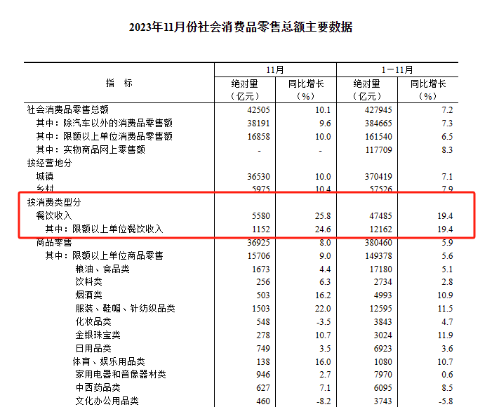 12月15日,国家统计局发布11月份国民经济消费数据。数据显示,11月全国餐饮收入5580亿元,同比增长25.8%;其中限额以上单位餐饮收入1152亿元,同比增长24.6%。1—11月,全国餐饮收入47485亿元,增长19.4%。
