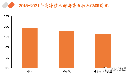 2015年到2021年茅台和五粮液的销量增速与中国高净值人群的增速,有很高的吻合度,高端白酒的增长主要靠高净值人群的增长来拉动,整体上受社会财富增长的影响。