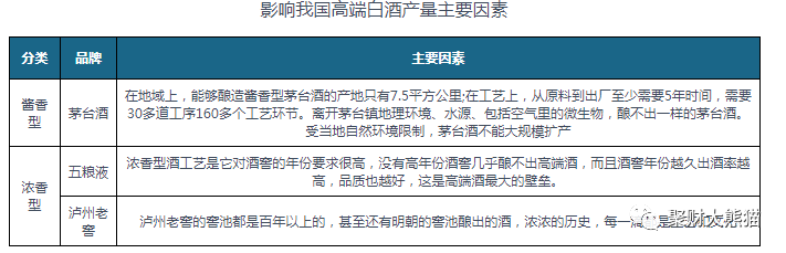 白酒分为酱香型和浓香型,市场份额分别为30%和70%。高端白酒中,酱香型代表是茅台,浓香型代表是五粮液和泸州老窖。酿造高端白酒不仅需要时间上的等待,更需要对酿酒环境温度、气候、水源、微生物上的把控。所以这些条件都是影响我国高端白酒发展最大壁垒。但是,也正是由于比较稀缺,才在一定程度上造成了高端白酒供不应求的局面。