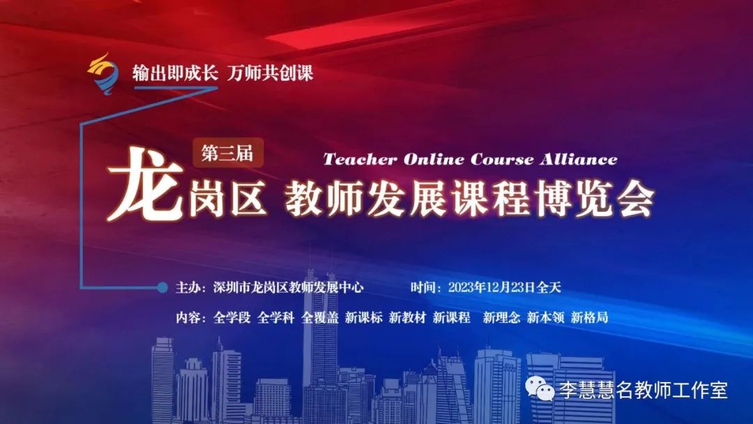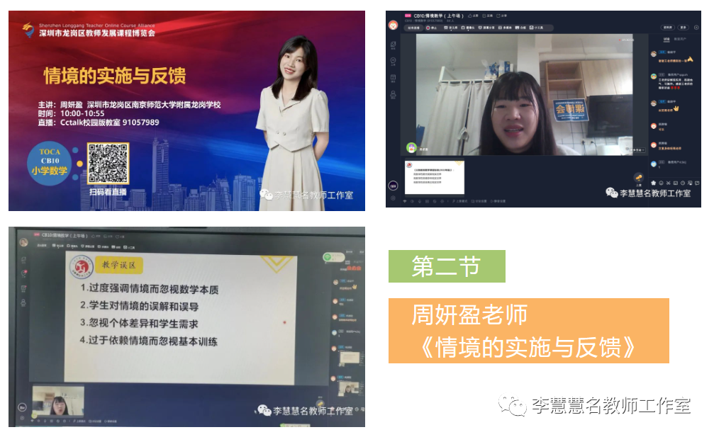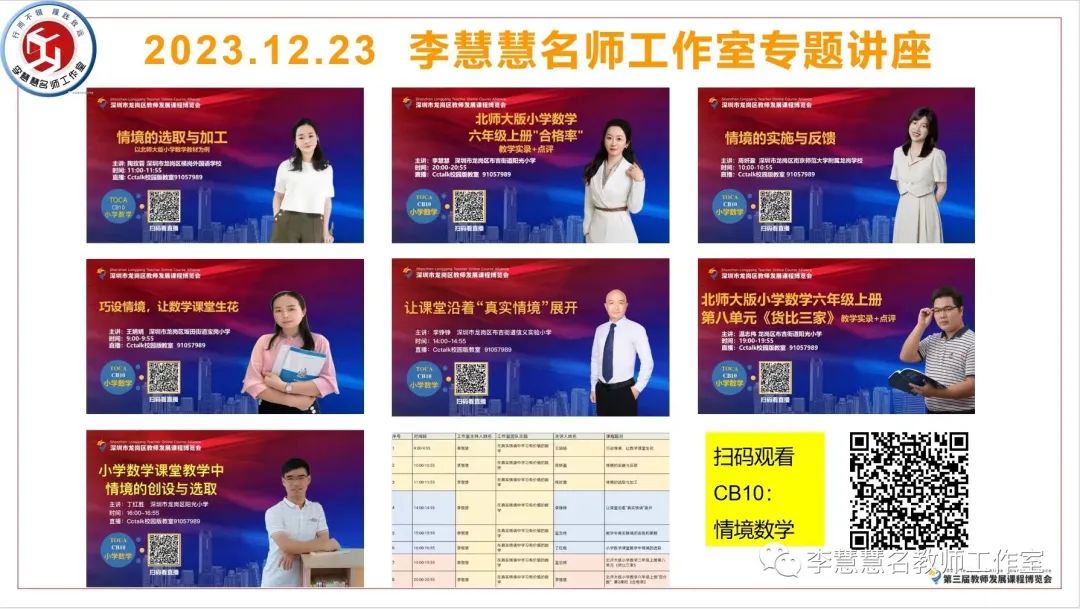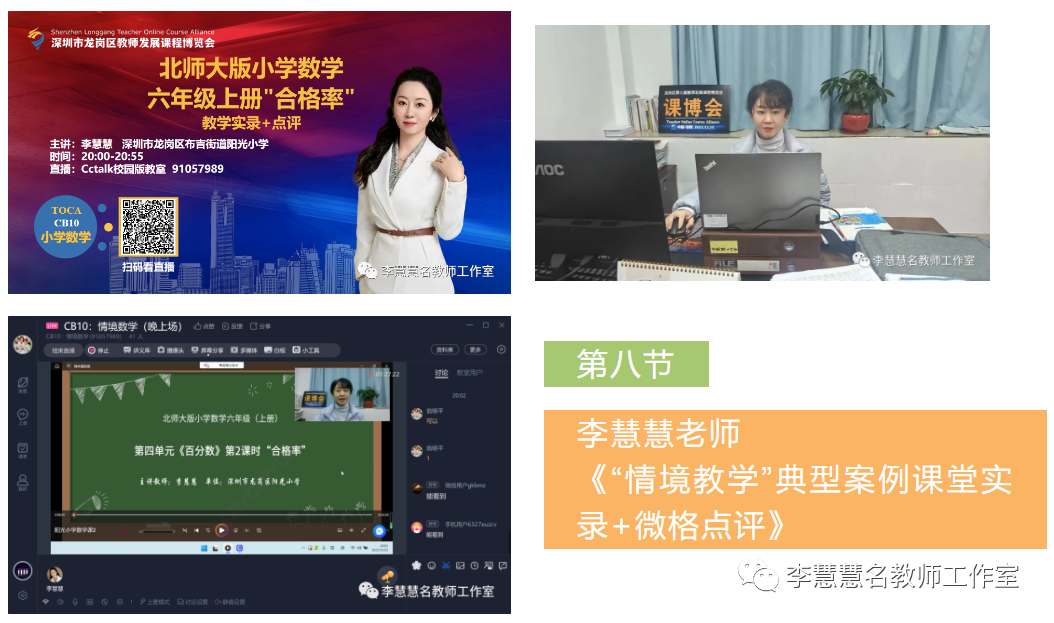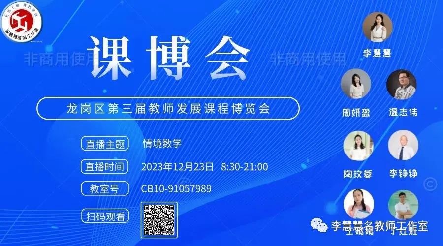 2023年12月23日,深圳市龙岗举行第三届教师发展课程博览会。龙岗课博会规模大、成系统、精筹划,是龙岗教育的创举,也是深圳教育的创新;是属于龙岗广大一线教师集体智慧成果展示的盛会。课程覆盖幼儿园到高中全学段、全学科、全序列,涵盖学校管理、班级管理技巧、班主任专业技能、教师通识能力、教育科研、学前教育、心理健康与教学技能、信息技术运用以及各学科教学等主题。李慧慧老师积极响应龙岗区教育部门号召,带领工作室全体成员加入这场万众瞩目的课博盛宴中。工作室以研究主题“情境数学”为核心,开展了全天候为数八节课的直播专场。“行而不辍,履践致远”,李慧慧名师工作室将继续充分发挥名师引领和辐射作用,助力打造龙岗品牌,增强龙岗教育乃至深圳教育的影响力。