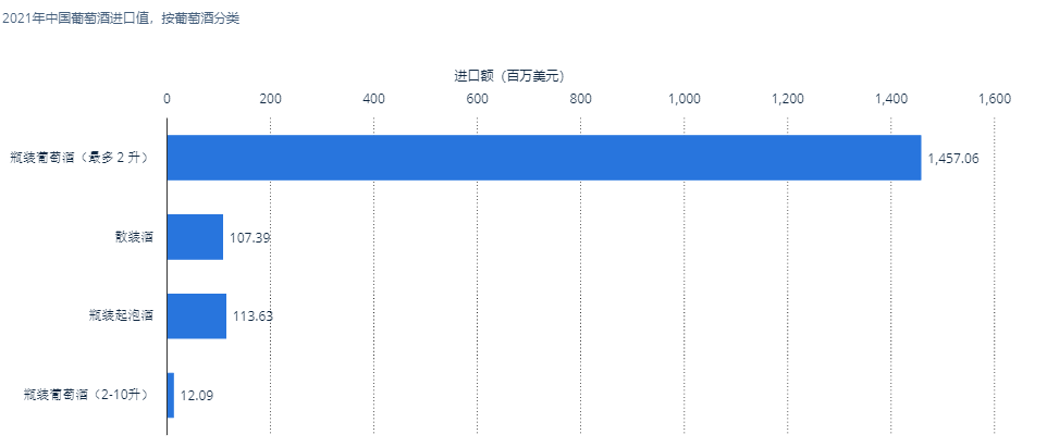 在我国葡萄酒消费市场中,进口葡萄酒一直是主力军,消费市场也甚是火热,据中国商务部资料显示:2021年,中国进口了价值约16.9亿美元的葡萄酒。两升以下的瓶装葡萄酒约占进口总额的14.6亿美元。