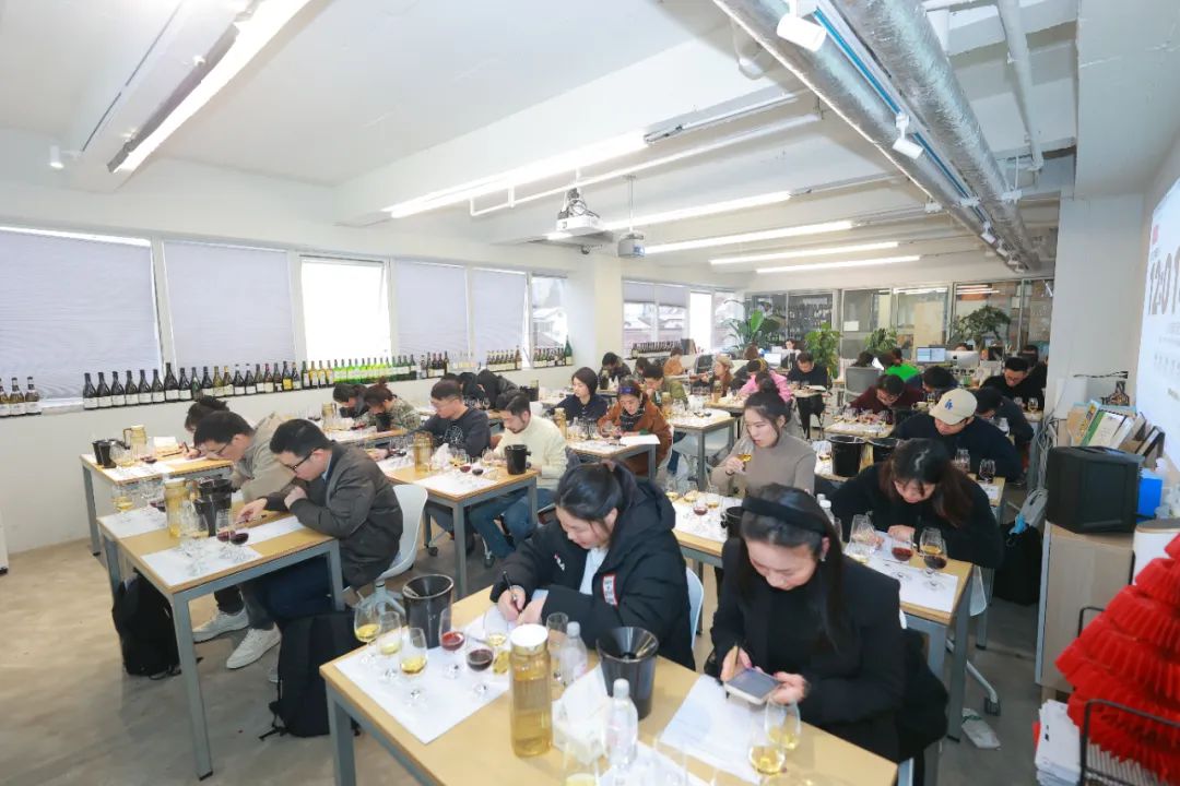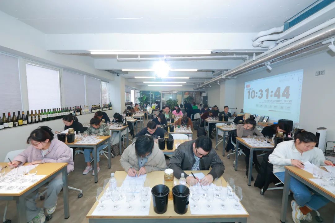 第二天进行的是安盛酒业甜酒学员认证讲师培训考核。考核分为笔试和盲品。各路学员奋笔疾书,本场考核的目的,一来,也是最为重要的是检验学员对第一天三位酿酒师教授的甜酒知识是否掌握,能否学以致用;二来唯有通过考核才可以作为讲师教授安盛甜酒学院官方认证课程,三来,也是对本场考核获胜者的奖励,前三甲可以作为优秀学员前往欧洲安盛酒业总部,游历这三座世界甜酒名庄。