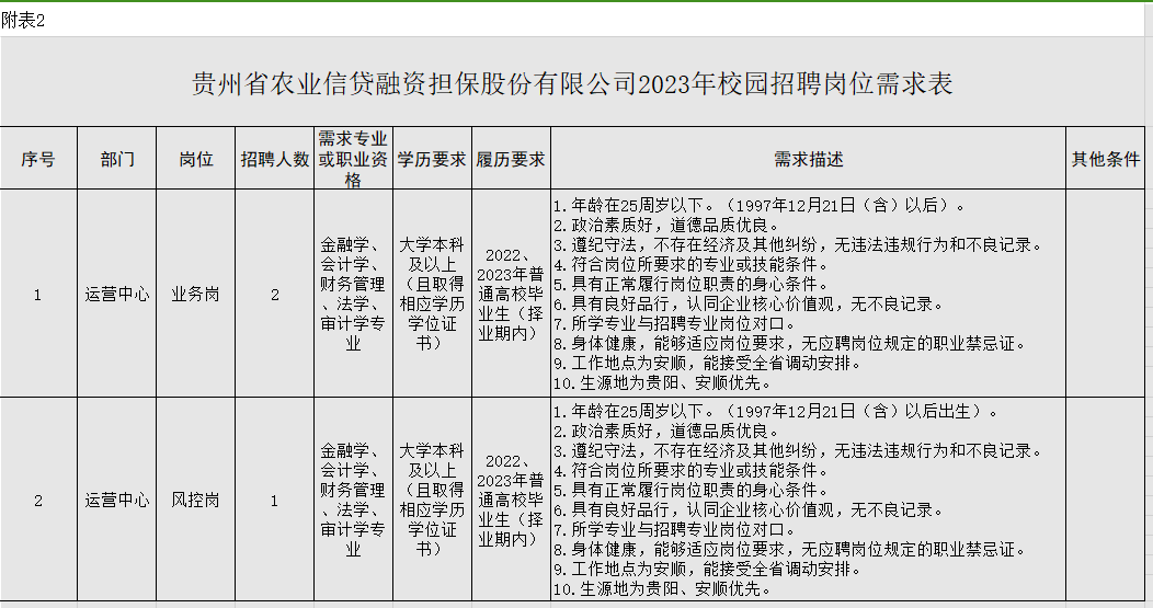 2.贵州省农业信贷融资担保股份有限公司2023年校园招聘岗位需求表