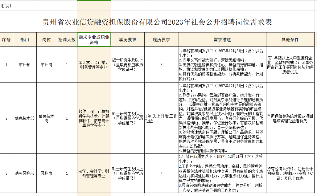 附表:1.贵州省农业信贷融资担保股份有限公司2023年社会公开招聘岗位需求表
