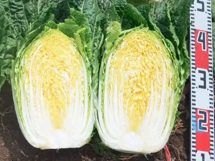 杂交种。属中小型早熟白菜品种。定植后55天左右可收获,外叶浓绿色,内叶黄色,叶片合抱,圆筒形。菜型美观、叶脉薄、结球能力强,球高28cm,直径17cm,单球重1.2~2.0千克,耐抽薹,耐贮运。中抗芜菁花叶病毒病,抗霜霉病。