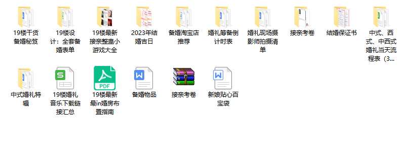 内含:整蛊小游戏整理、备婚干货、全套备婚表单、备婚淘宝店选择、筹备倒计时表、婚礼拍摄清单、婚礼流程表、婚礼音乐……