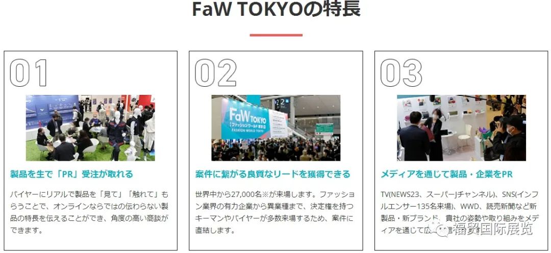 FaW TOKYO展会上届汇集来自全球的1,000家参展商,集结最新可持续时尚,潮牌男装女装、箱包、鞋靴、饰品配件、面料辅料、时尚科技相关产品,是中国企业开拓日本时尚市场的最佳平台。