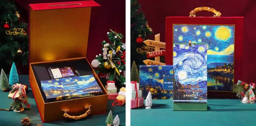 礼盒满满的细节,中间是梵高著名画作“星夜”,高度夸张变形的星空营造出强烈的视觉对比。