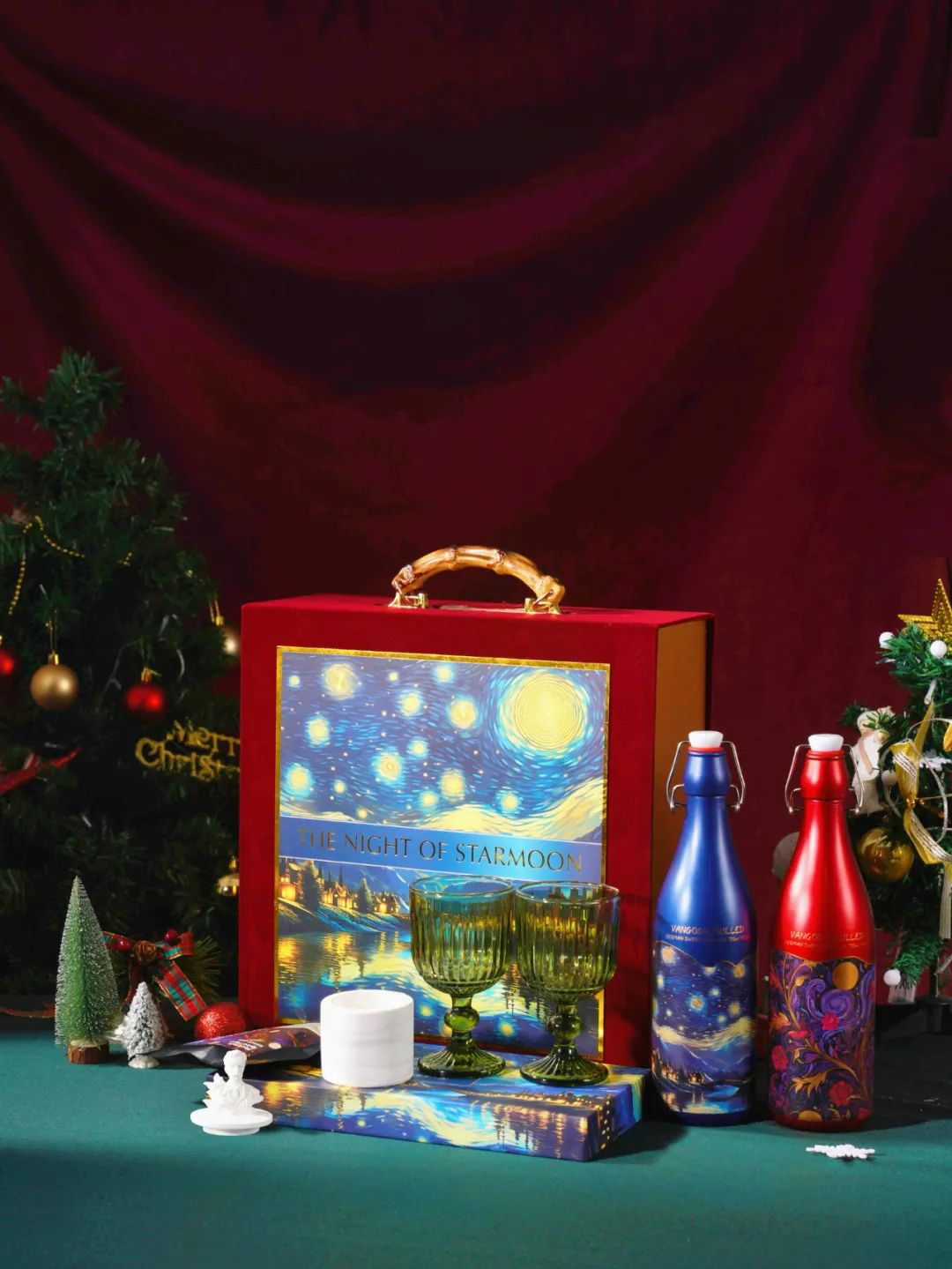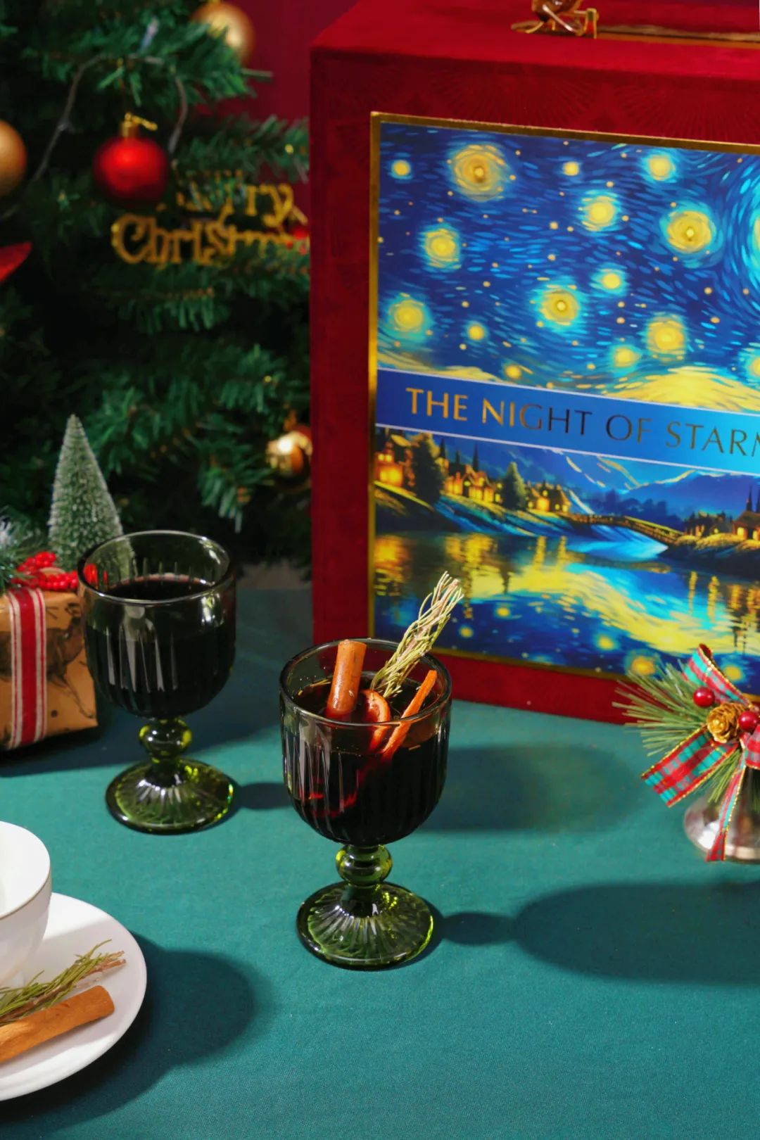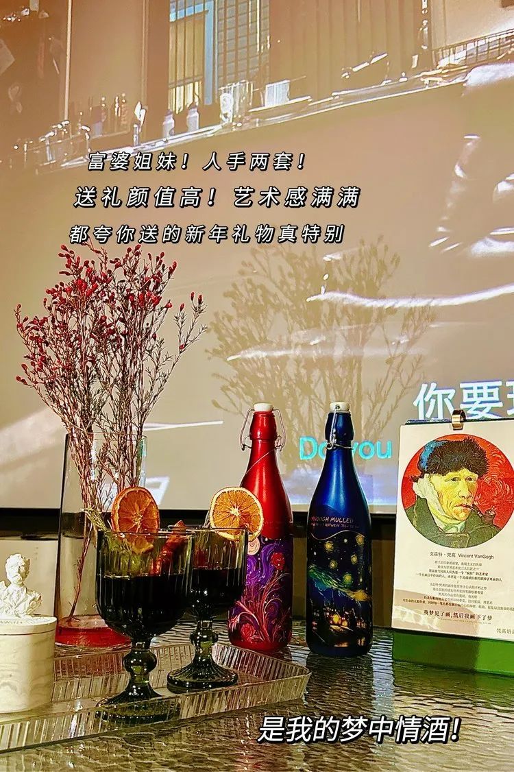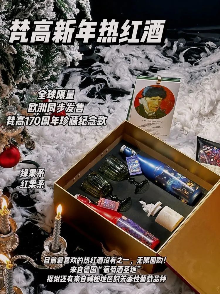 每当这熟悉的旋律响起,意味着期待了整整一年的圣诞节就要来啦~~~我已经想好了,约上三五个好友互换礼物,然后聊聊天、拍拍照,再发条朋友圈......简单又有氛围感。当然,圣诞节该有的仪式感还是要有的,比如再来一杯升温的“热红酒”。热红酒是源自德国的一种酒饮,会在每个冬天准时出现。在德国的圣诞市集上,热红酒被称为Glühwein,与古希腊医学之父Hippocrates同名。采用红葡萄酒、香料和柑橘水果制作而成,是圣诞市集上蕞受欢迎的饮品之一。我一到秋冬,就特别爱喝热红酒,不仅因为节日氛围浓烈;而且热红酒口感酸甜,就算不爱喝酒的女生都会爱上它的香气。马上就要圣诞、元旦、新年啦,今天我特地挑了一款超适合做热红酒的葡萄酒:古典手提箱的造型,再加上艺术性的星空元素,真的格调满满。而且《星空》由梵高基金会正版IP授权,不是市面上劣质的仿品,节日送人或者自用,面子、仪式感都有了~而且现在下单,你不仅只有收到两瓶热红酒,套盒里还有:整套搭配在一起,氛围感满满,真的是凡尔赛高端送礼神器!!!难怪欧洲一上市就被疯抢一空,全球官网价1280,现在268元就能拿走,谁能不爱?!把梵高传世名作《星月夜》搬到了酒瓶上,瓶身设计是梵高酒庄新年限定❤️红?蓝配色。梵高星空点点的星光,包裹住整个瓶身,艺术感十足的同时增加了满满的圣诞氛围感。而且酒瓶喝完,我都都舍不得丢掉,可以拿来当装饰品哦~一套就可以喝到两种口味的地道德国??红酒,真的太棒了!!!梵高的这两瓶红酒,属于单喝甘甜,当热红酒更有一番风味。而且红酒在出厂的时候已经调配好了,不需要再加入冰糖等调味。简直又好喝又出片~不会煮热红酒的小姐妹也不用担心翻车~没有乱七八糟过重的八角肉桂中药味,入口是纯粹清甜〰️浓郁的果香和淡淡的肉桂~滋味甜美浓郁,又没有多少酒精度,捧在手里还觉得暖身暖心。