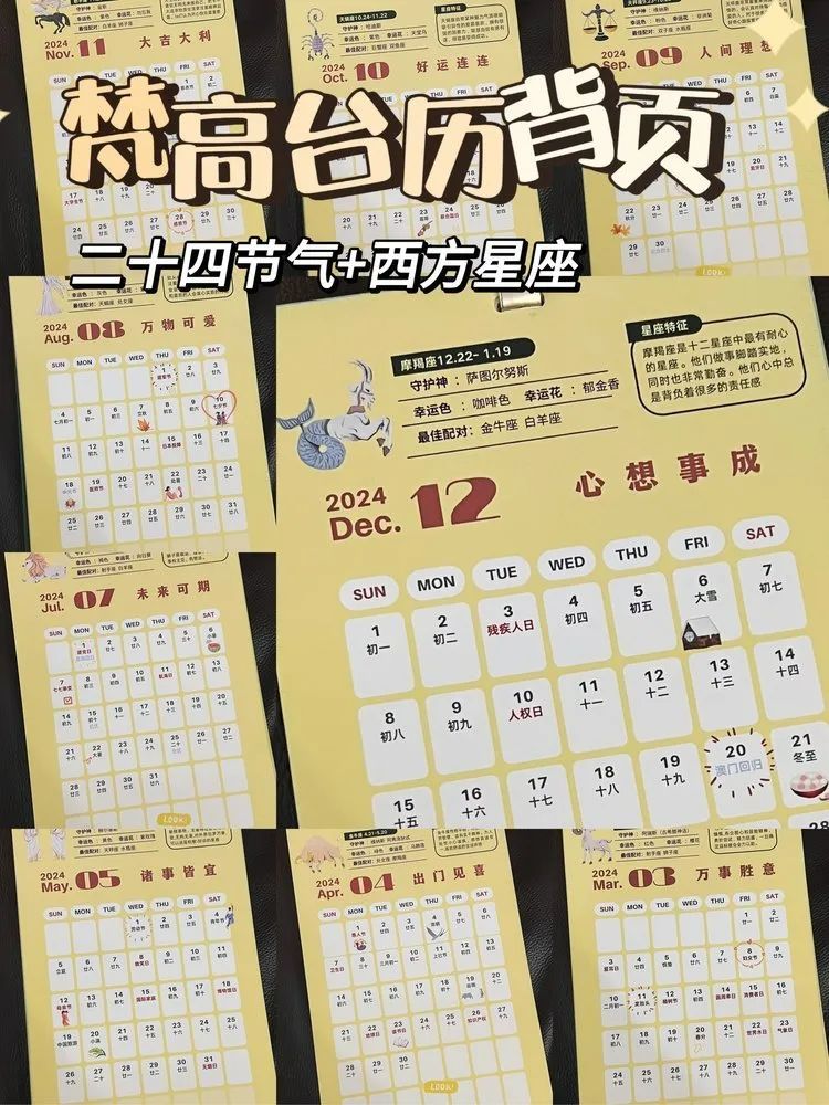 不仅标注了中国的二十四节气,还有西方的星座、星座的守护神、幸运色、幸运花、星座的特征。