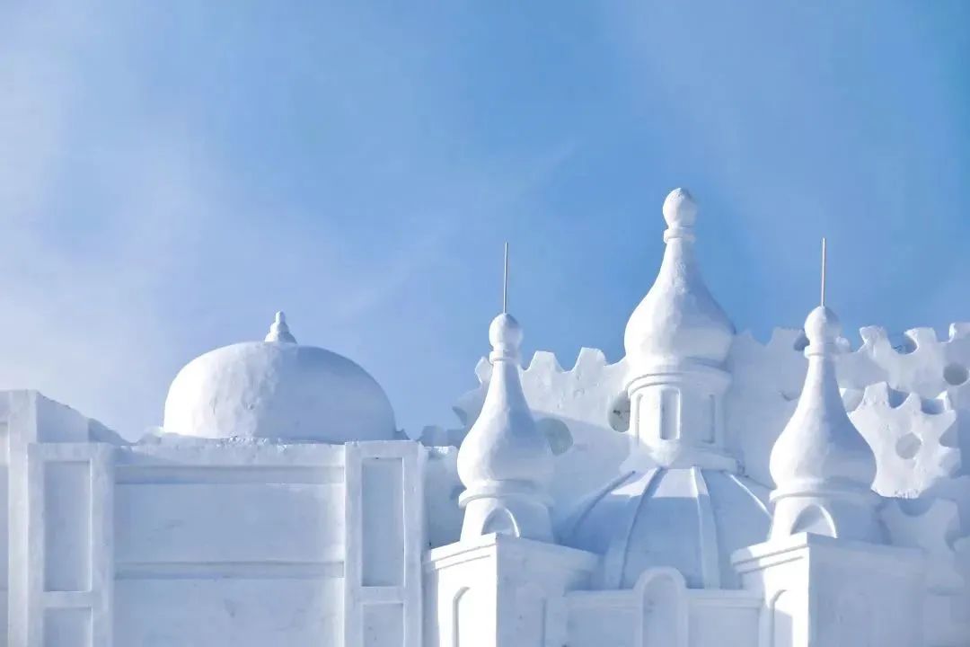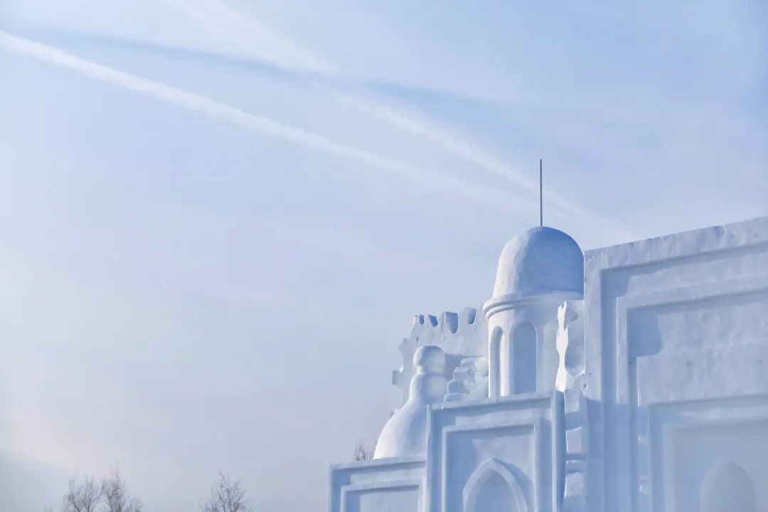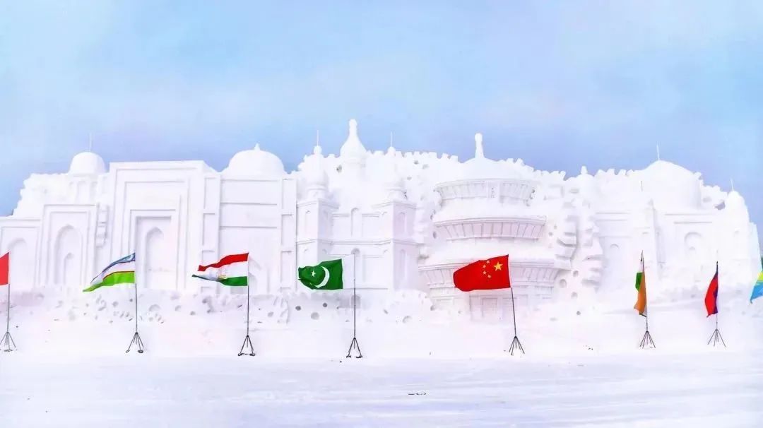 在第35届太阳岛雪博会的园区内,有一座彰显国际范儿的雪塑——《合作共赢》,它以上合组织为构思,以上合组织八个成员国的建筑特色为设计理念,将八个国家的建筑风格融合在一起。长42米、高12米,总用雪量3500立方米,位于断桥东侧,面对主塑《逐梦》的左手边。