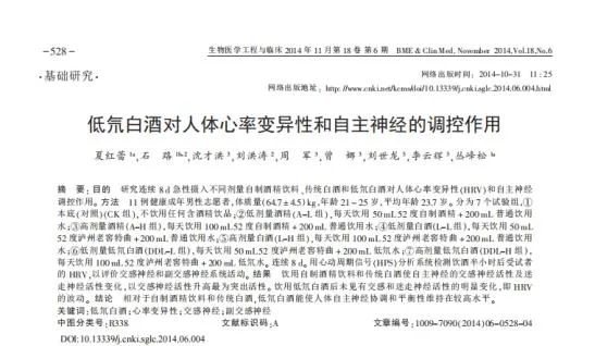 [16]夏红蕾,石路,沈才洪等.低氘白酒对人体心率变异性和自主神经的调控作用[J].生物医学工程与临床,2014,18(06):528-531.