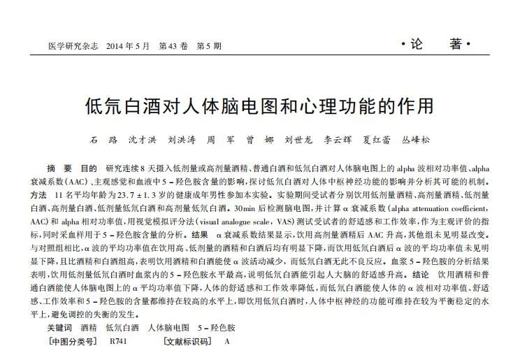 低氘白酒能使人体的α波相对功率值、舒适感、工作效率和5-羟色胺的含量都维持在较高的水平上,即饮用低氘白酒时,人体中枢神经的功能可维持在较为平衡稳定的水平上,避免调控失衡的发生。