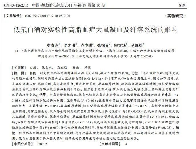 低氘水和白酒分别作用于高脂实验对象时,均可改善高脂实验对象的凝血和纤溶系统,从而起到保护心血管系统的作用。
