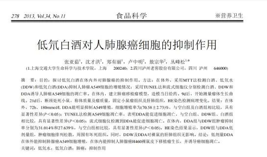 上海化工研究院有限公司精细化工研究所王晓秋、朱琦、凌钦才、朱志亮等署名的研究成果《低氘酒中关键组分的分析测定研究》显示,低氘酒就是低氘水在饮料用水方面的应用尝试,低氘白酒能使人体自主神经协调和平衡性维持在较高水平,显著降低酒精毒性的作用,减少酒精肝病的发展,能干预降低糖尿病血糖水平,提高血浆胰岛喜报水平,减轻胰岛细胞损伤。中国著名酿酒大师、首批国家级非物质文化遗产代表性传承人沈才洪等从2010年至2014年在《食品科学》等公开学术刊物连续发表多篇低氘白酒对人体影响的论文,结果表明饮用低氘酒对人体有益,低氘水与白酒联合使用具有协同作用进一步抑制肿瘤细胞生长。
