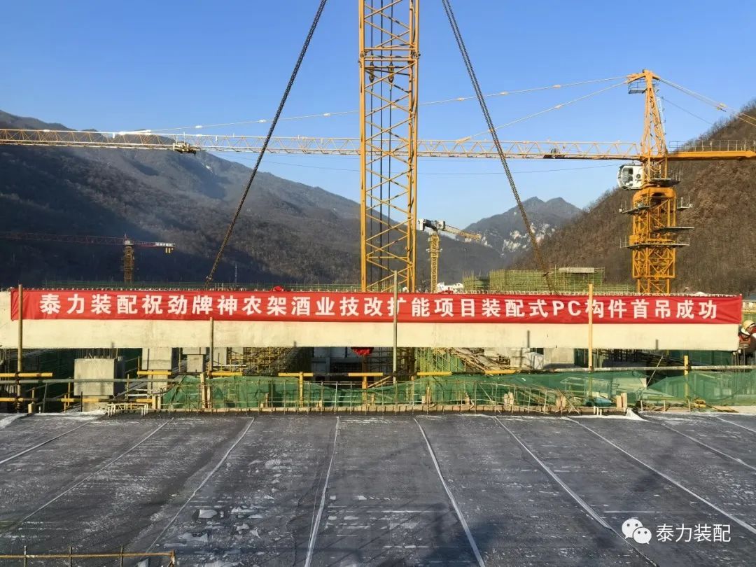 2023年12月24日8:16分,由湖北泰力建筑装配科技有限公司(以下简称“泰力装配”)制造的PC构件在劲牌神农架酒业技改扩能项目正式启动首轮吊装,标志着该项目全面进入装配式施工阶段。