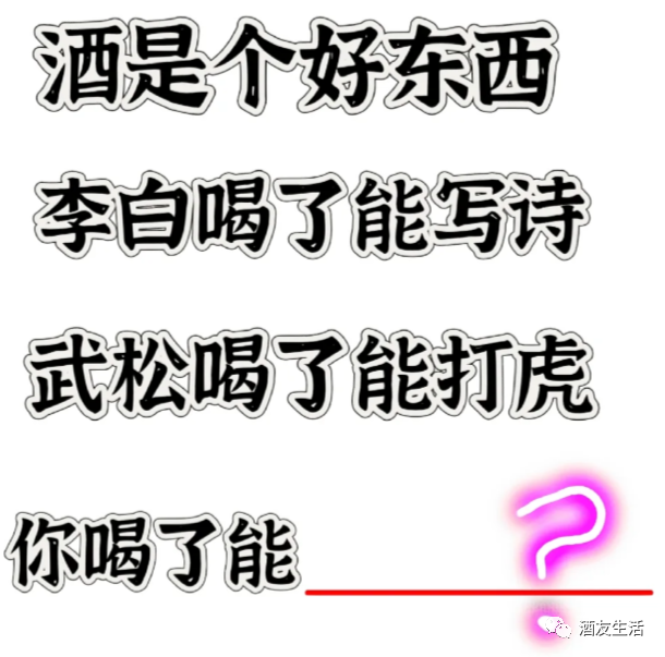 这位朋友如果让他写诗他只能说一句:“好酒!”看来他是个实实在在的酒友啊!这哥们儿酒后能让老虎写诗,这可是个新鲜事儿,不知道老虎写出来的诗是咋样的,有机会真得见识见识。这位更是个人才啊,喝了酒居然敢上讲台和老师打醉拳,这得是多大的胆子啊,估计酒醒后得后悔死。这位小朋友很实诚啊,直接说自己才五年级不能喝酒,看来还是个乖孩子哈酒友8:我喝了能发疯(武松打不过,李白连夜为我写诗的那种)这位朋友酒后能发疯到武松都打不过、李白连夜为他写诗的地步,这得是多疯狂的酒后状态啊!酒友9:我喝了,没有李白的才华,没有武松的勇猛,只有两行轻泪和道不尽的苦楚这位朋友酒后流露出内心的脆弱,没有李白的才华和武松的勇猛,只有两行轻泪和道不尽的苦楚。看来白酒不仅能壮胆还能让人真情流露啊。酒友10:酒是好东西,喝了他,就上头,一会能让天地旋转,一会能让星光璀璨,或者是翻浆倒海,或者脚踏云端,又如千军万马奔腾而过,又如一头栽入沼泽,它可以让懦夫强悍,也可以让悍匪服软,它可以庆功,它又会让人别无他念。它可以让你推心置腹,也可以让你口若悬河。喝了它李白是谁,喝多了我才是武松。这位兄弟对白酒的理解很深刻啊!他说白酒能让天地旋转、星光璀璨也能让人翻江倒海、脚踏云端。懦夫喝了能变强悍悍匪喝了也能服软它可以庆功也可以让人别无他念。喝了白酒推心置腹、口若悬河也不在话下。最后他还说:“喝了它李白是谁?喝多了我才是武松!”看来他对自己酒后的状态非常自信啊!这位朋友酒后要和李白一起写诗还要和武松一起去端老虎窝这酒后胆识和想象力真是让人佩服!这位兄弟酒后话匣子就打开了滔滔不绝可劲说看来白酒还能让人变得健谈起来。酒友13:我喝了就让李白骑着虎找武松算账……为什么打李白的坐骑。让武松写几首好诗骂骂李白这位朋友酒后让李白骑着虎找武松算账为什么打李白的坐骑?还要让武松写几首好诗骂骂李白这酒后戏精上身了啊!