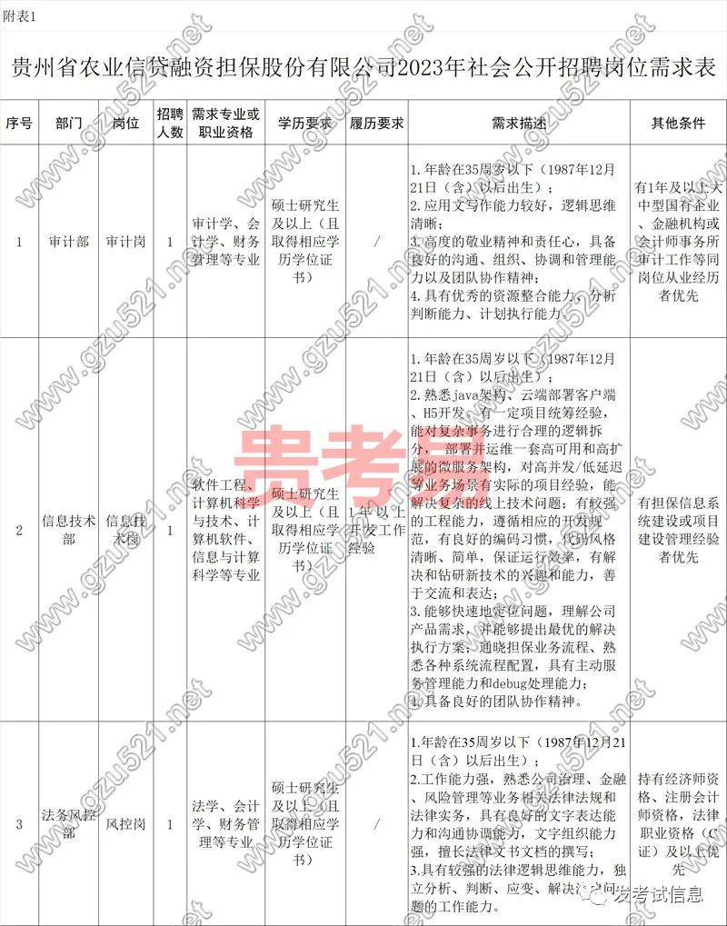 附表:1.贵州省农业信贷融资担保股份有限公司2023年社会公开招聘岗位需求表