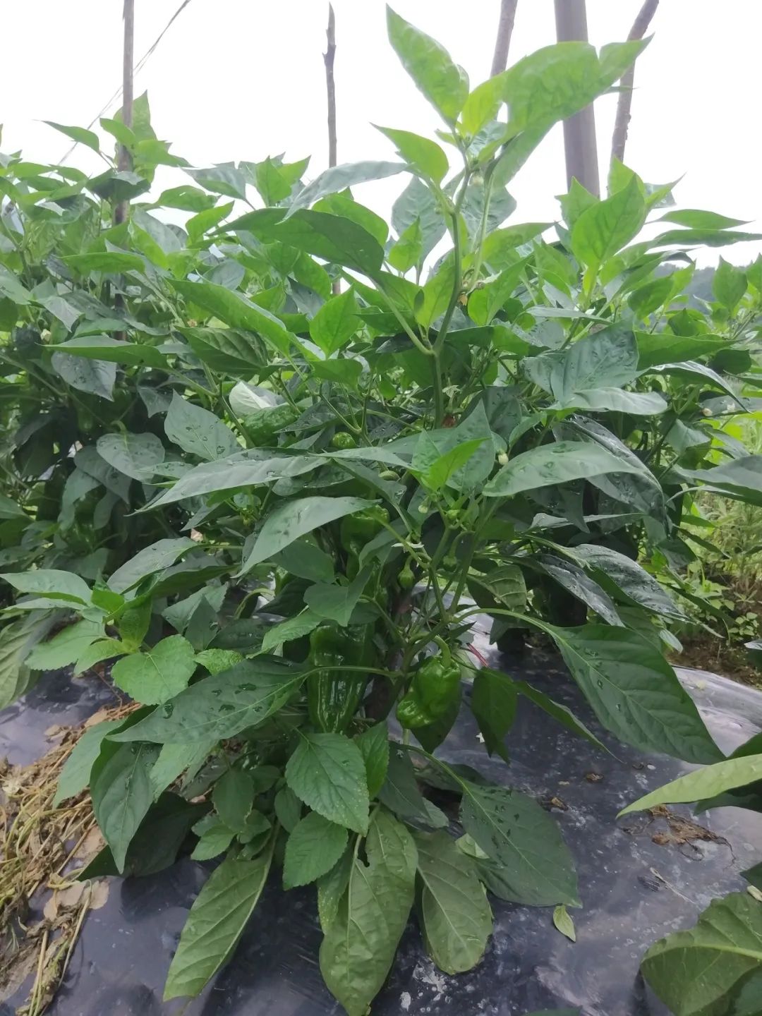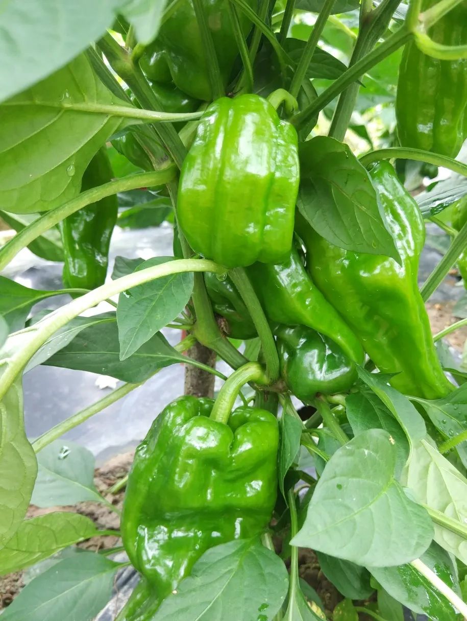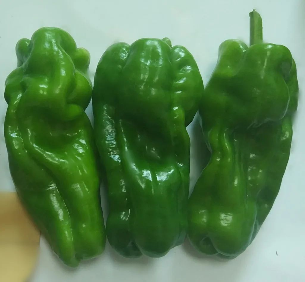 长灯笼形,果长约13cm,果肩宽约6cm,单果重约70克,果厚约0.2cm,无辣味,果皮绿色光泽感强,生长旺盛,初花高度约12cm。