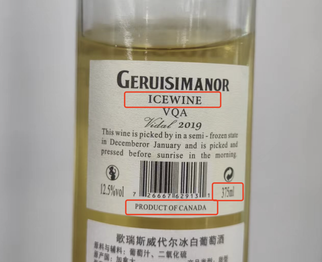 瓶身上标“Icewine”、“Product of Canada”,容量基本以375ml或200ml为主。