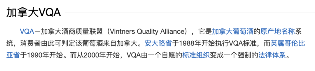 VQA的全称是Vintners Quality Alliance,中文是加拿大酒商质量联盟,用来表示加拿大原产地名称系统,其级别相当于法国的AOC。
