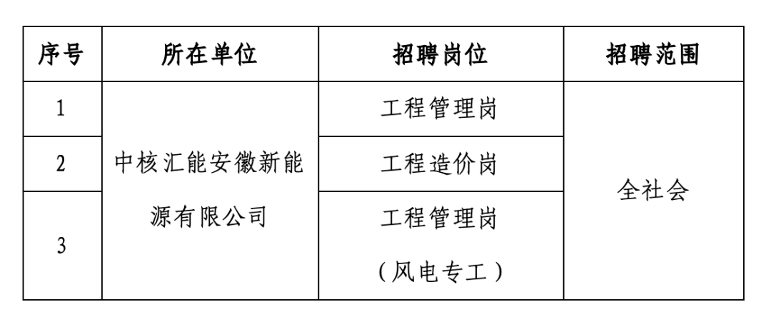 详见附件1《中核汇能安徽新能源有限公司社会招聘岗位一览表》