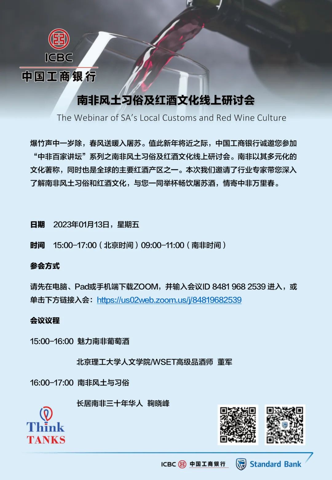 “中非百家讲坛”系列之南非风土习俗及红酒文化线上研讨会。南非以其多元化的文化著称,同时也是全球的主要红酒产区之一。本次我们邀请了行业专家带您深入了解南非风土习俗和红酒文化,与您一同举杯畅饮屠苏酒,情寄中非万里春。