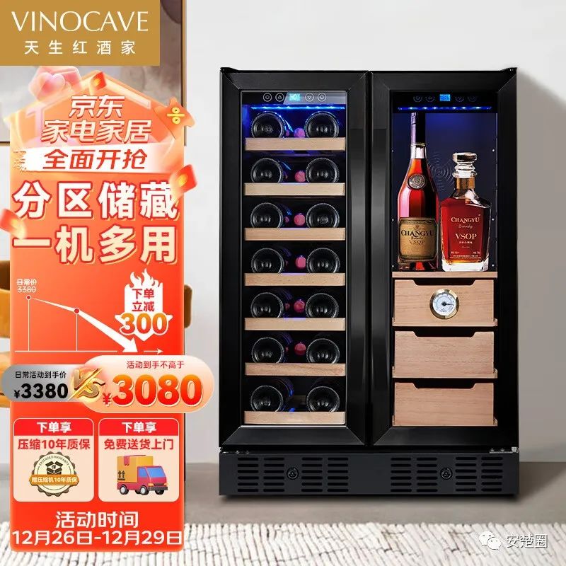 这款红酒柜是维诺卡夫(Vinocave)的风冷恒温雪茄茶叶红酒柜,是一款嵌入式双开门多功能时尚葡萄酒柜,可以储存150支红酒。它有上下两个独立的温区,可以实现5~20℃的宽幅变温,适合不同的酒类分区存放,也可以用来放置茶叶、雪茄等其他需要恒温保湿的物品。它采用风冷压缩机,制冷效果好,噪音低,寿命长。它的箱门是防凝露的,可以防止水汽在玻璃上形成水珠,影响观看效果。它的搁架是不锈钢和木质的,结实耐用,可以承受重量。它的外观设计简约时尚,可以与各种家居风格相配。如果您想要一个既能储存红酒,又能储存其他珍品的多功能酒柜,那么这款红酒柜是您的理想之选。