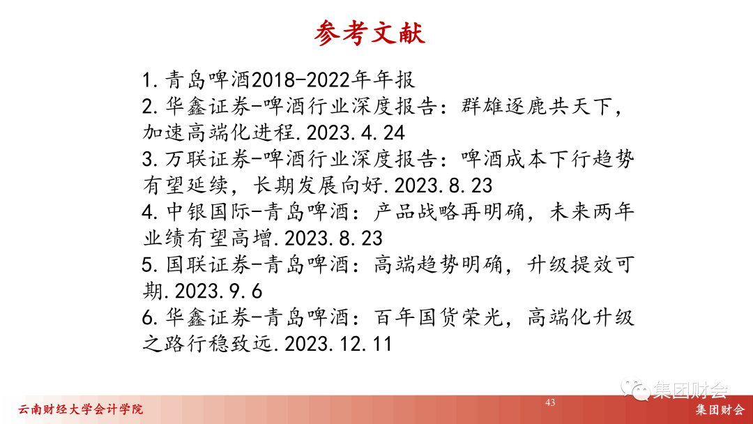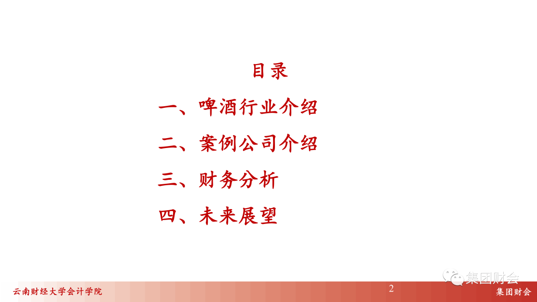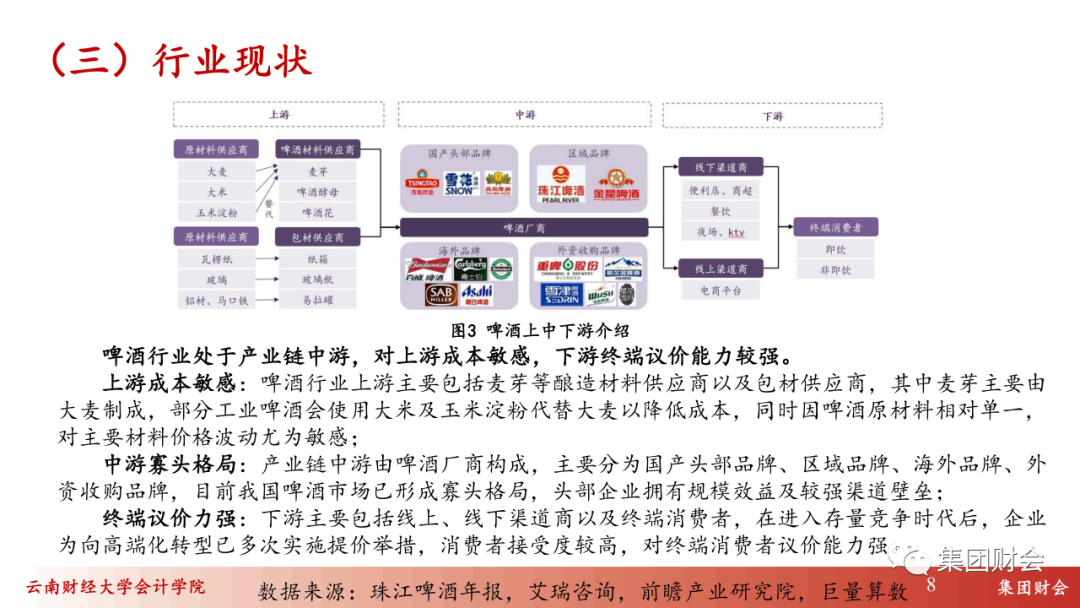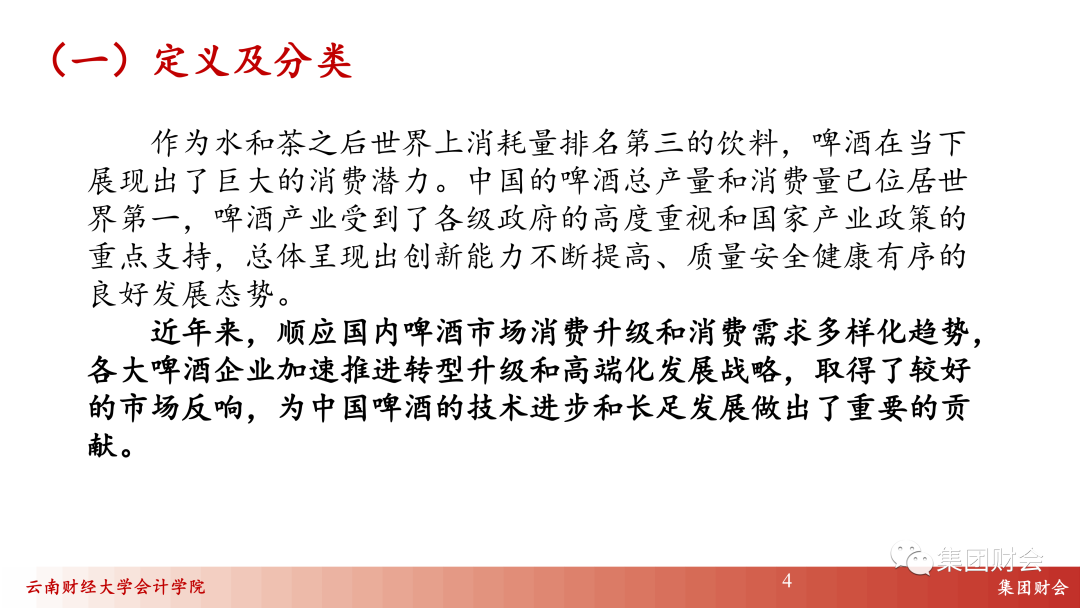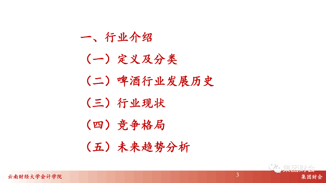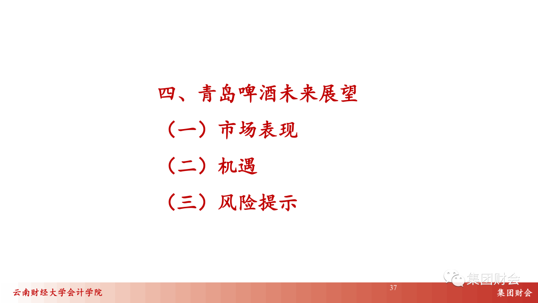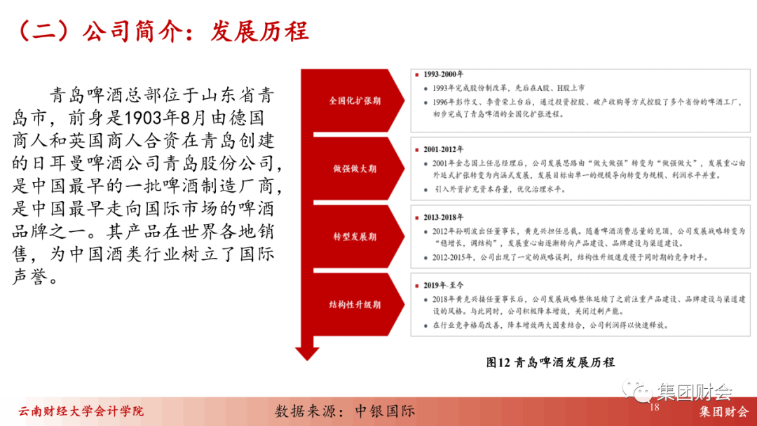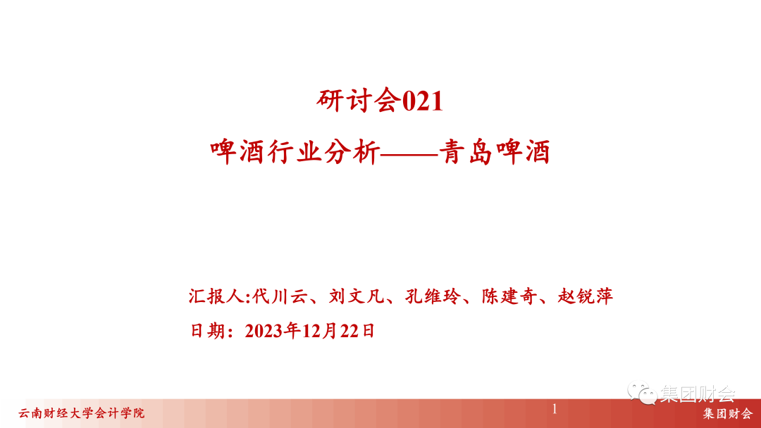 青岛啤酒作为我国啤酒行业的龙头,自1903年诞生起,就肩负起推动中国啤酒行业发展的重任,以其卓越的品质与独特的口感,受到国内外消费者钟爱。选择青岛啤酒作为研究案例,结合啤酒行业发展现状和竞争格局,分析了青岛啤酒的公司战略、产品结构和营销渠道,进一步对公司财务绩效及资本市场表现进行分析,在此基础上对青岛啤酒的未来发展趋势进行预测。旨在增加同学们对啤酒行业及青岛啤酒发展现状的了解,并给出适当的投资建议。