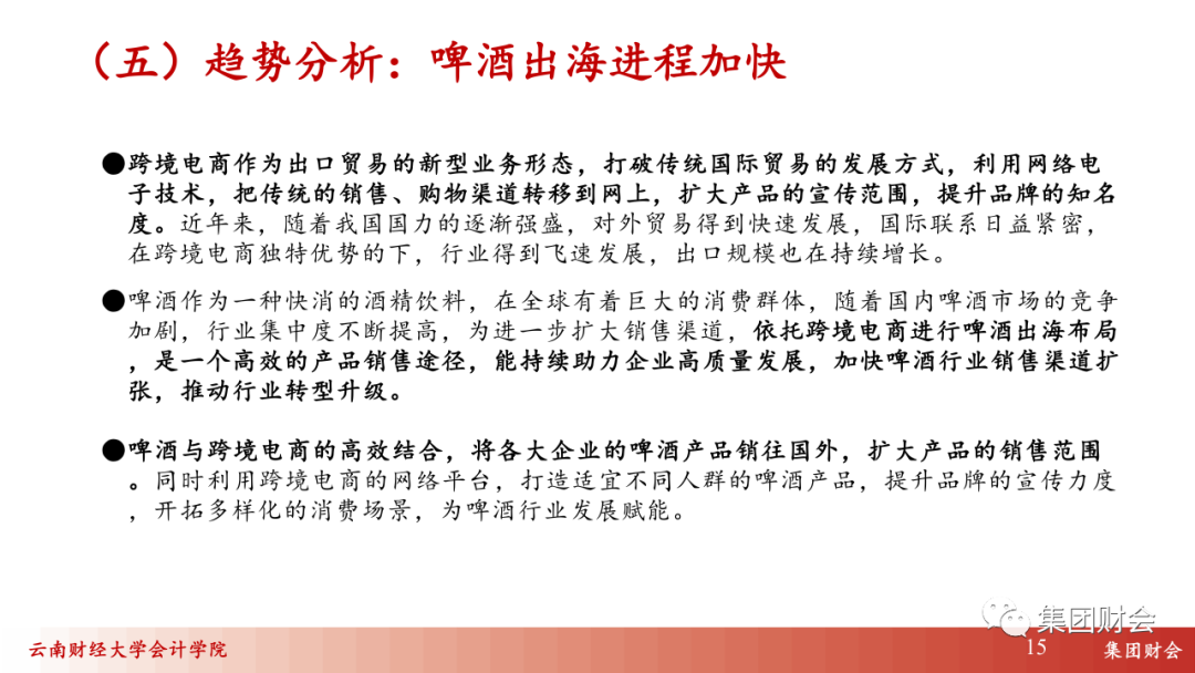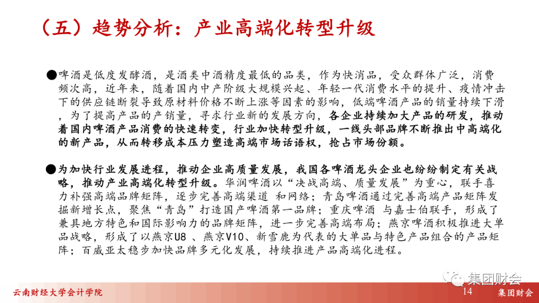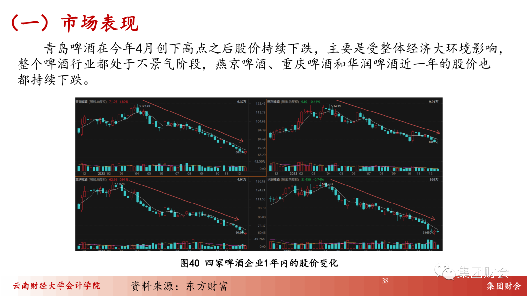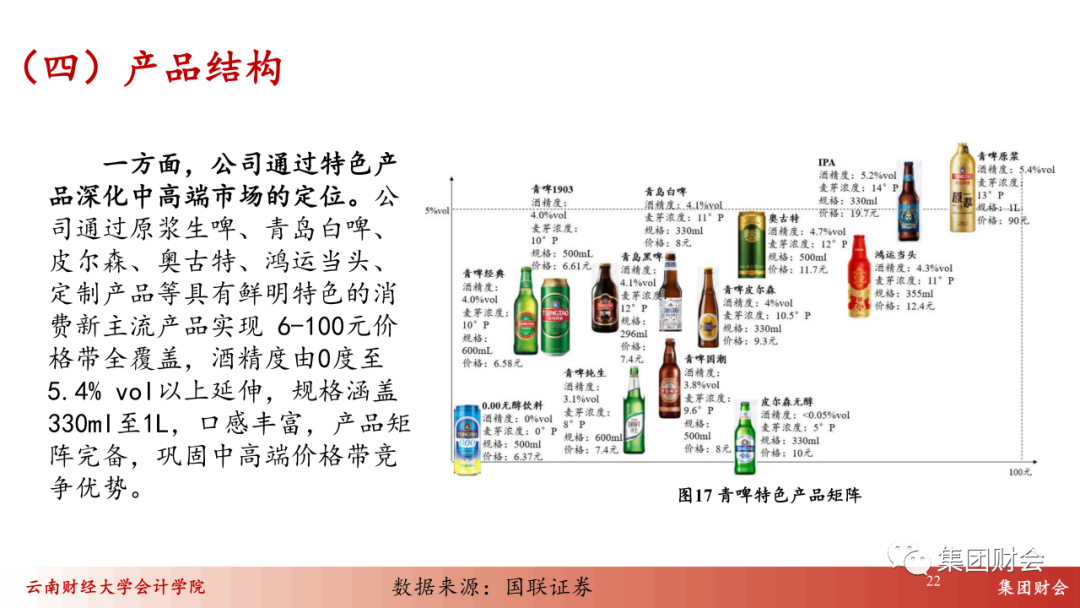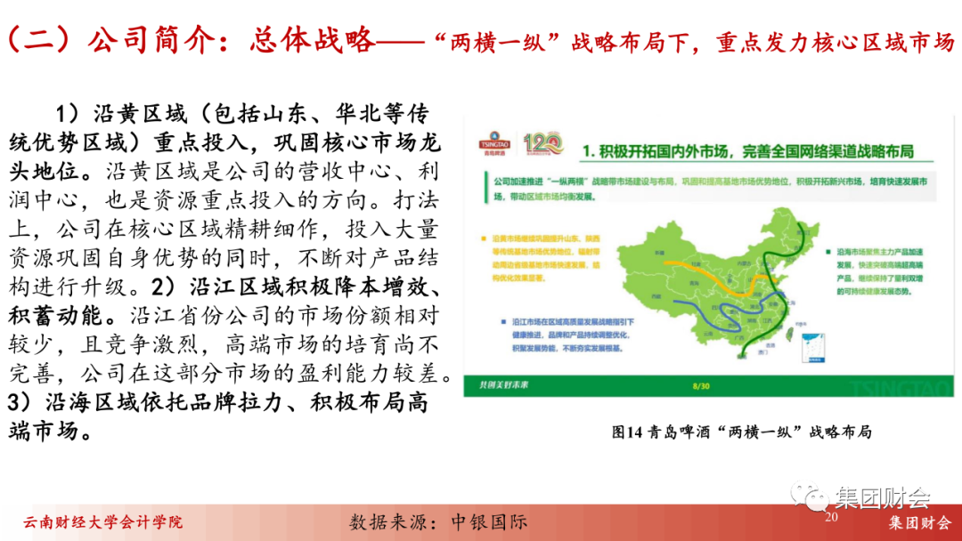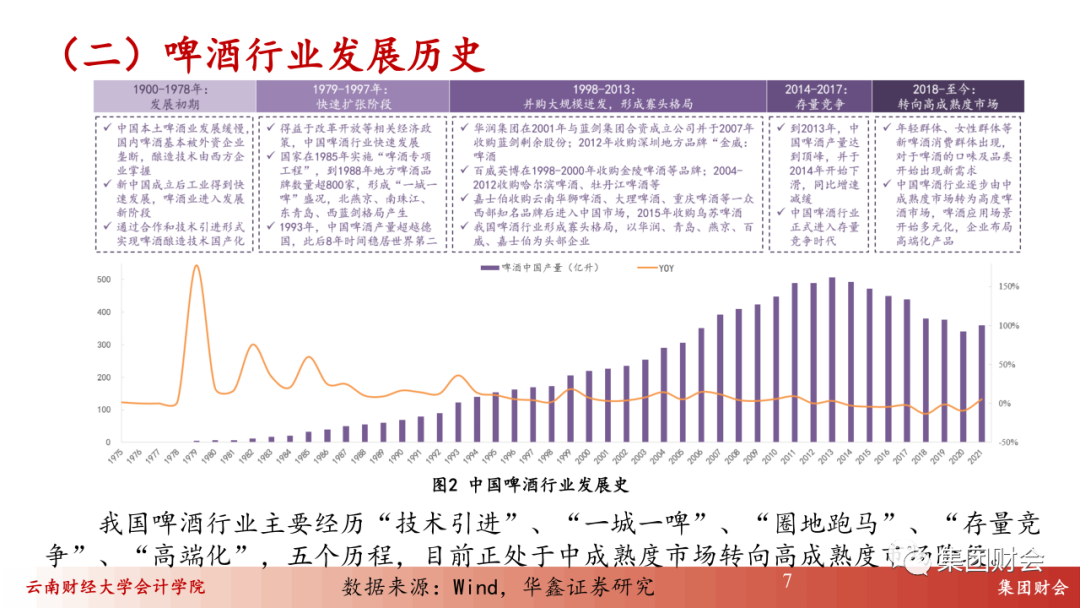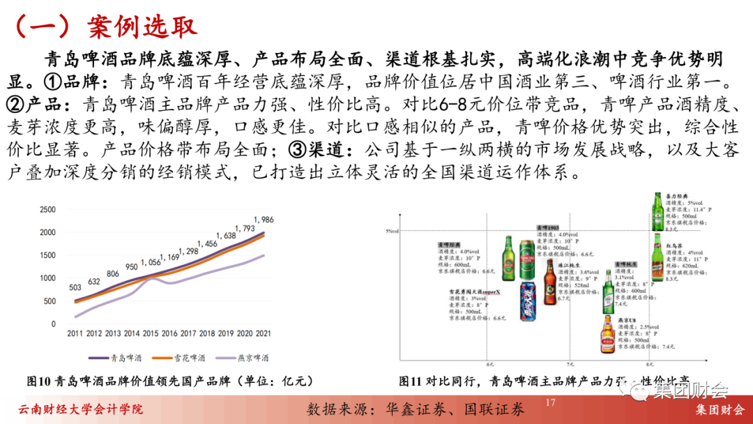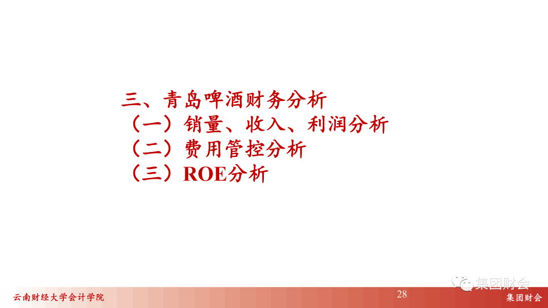 青岛啤酒作为我国啤酒行业的龙头,自1903年诞生起,就肩负起推动中国啤酒行业发展的重任,以其卓越的品质与独特的口感,受到国内外消费者钟爱。选择青岛啤酒作为研究案例,结合啤酒行业发展现状和竞争格局,分析了青岛啤酒的公司战略、产品结构和营销渠道,进一步对公司财务绩效及资本市场表现进行分析,在此基础上对青岛啤酒的未来发展趋势进行预测。旨在增加同学们对啤酒行业及青岛啤酒发展现状的了解,并给出适当的投资建议。