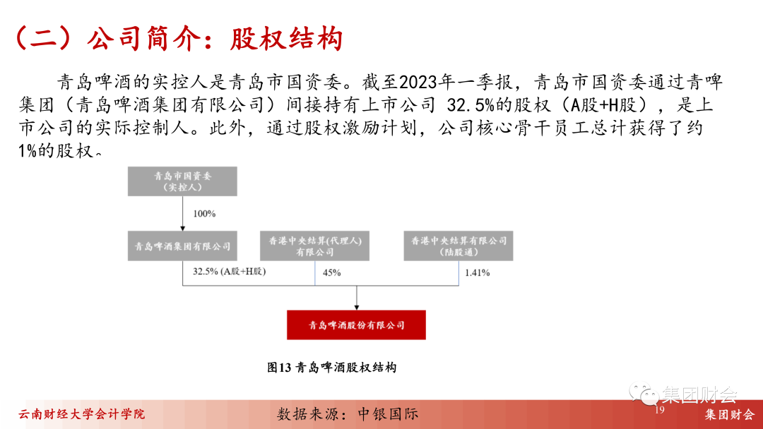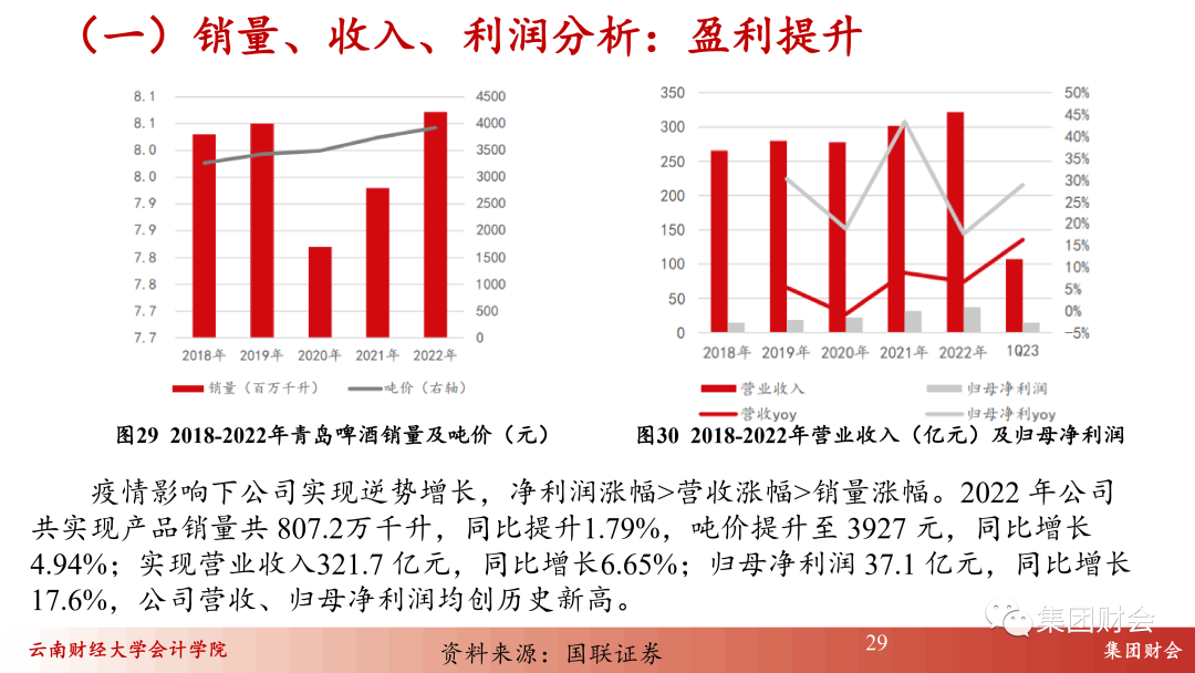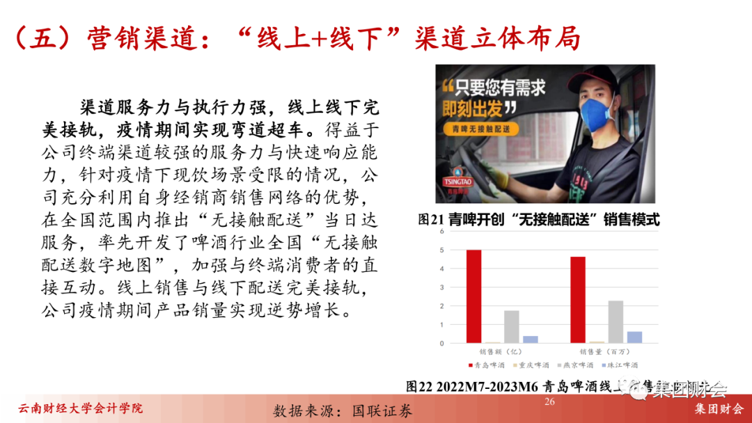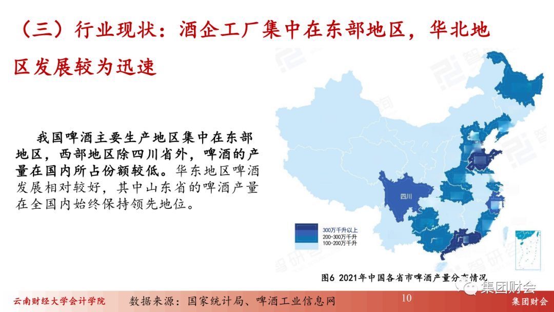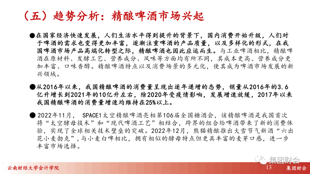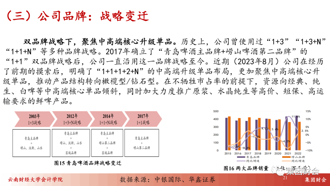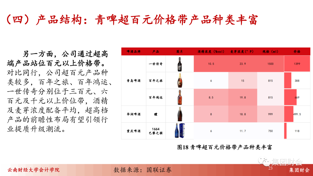 青岛啤酒作为我国啤酒行业的龙头,自1903年诞生起,就肩负起推动中国啤酒行业发展的重任,以其卓越的品质与独特的口感,受到国内外消费者钟爱。选择青岛啤酒作为研究案例,结合啤酒行业发展现状和竞争格局,分析了青岛啤酒的公司战略、产品结构和营销渠道,进一步对公司财务绩效及资本市场表现进行分析,在此基础上对青岛啤酒的未来发展趋势进行预测。旨在增加同学们对啤酒行业及青岛啤酒发展现状的了解,并给出适当的投资建议。