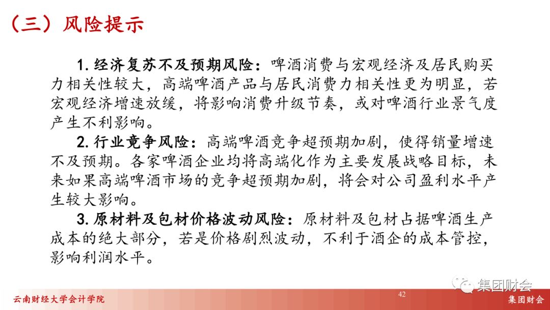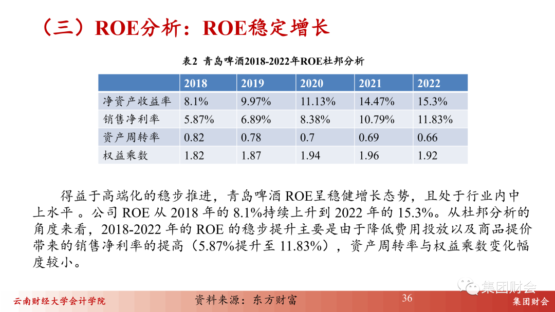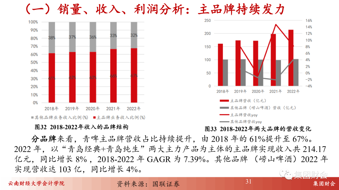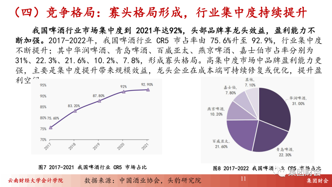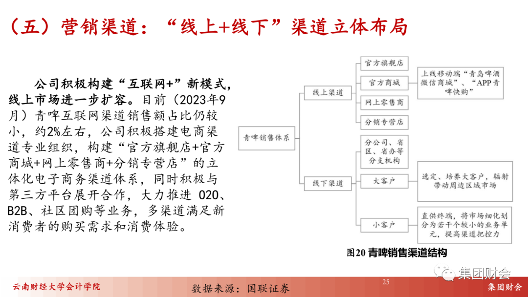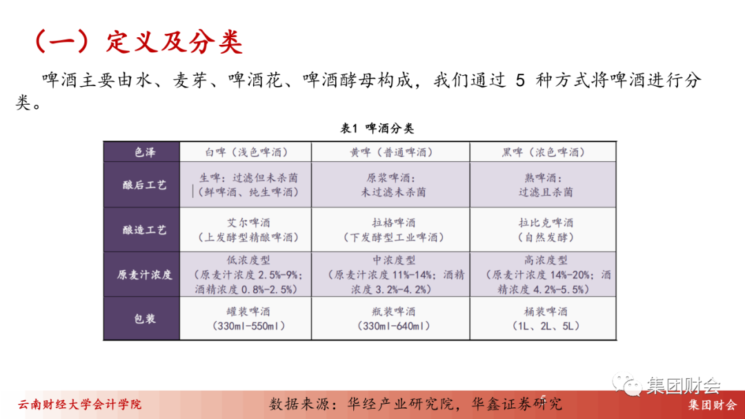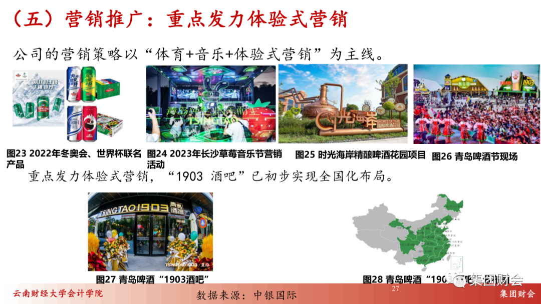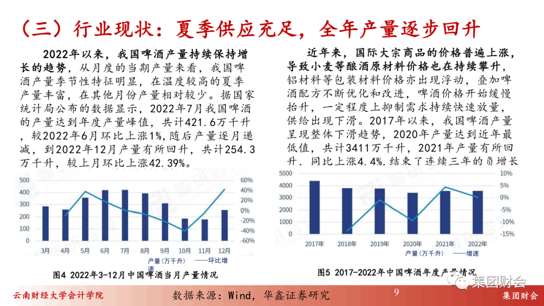 青岛啤酒作为我国啤酒行业的龙头,自1903年诞生起,就肩负起推动中国啤酒行业发展的重任,以其卓越的品质与独特的口感,受到国内外消费者钟爱。选择青岛啤酒作为研究案例,结合啤酒行业发展现状和竞争格局,分析了青岛啤酒的公司战略、产品结构和营销渠道,进一步对公司财务绩效及资本市场表现进行分析,在此基础上对青岛啤酒的未来发展趋势进行预测。旨在增加同学们对啤酒行业及青岛啤酒发展现状的了解,并给出适当的投资建议。