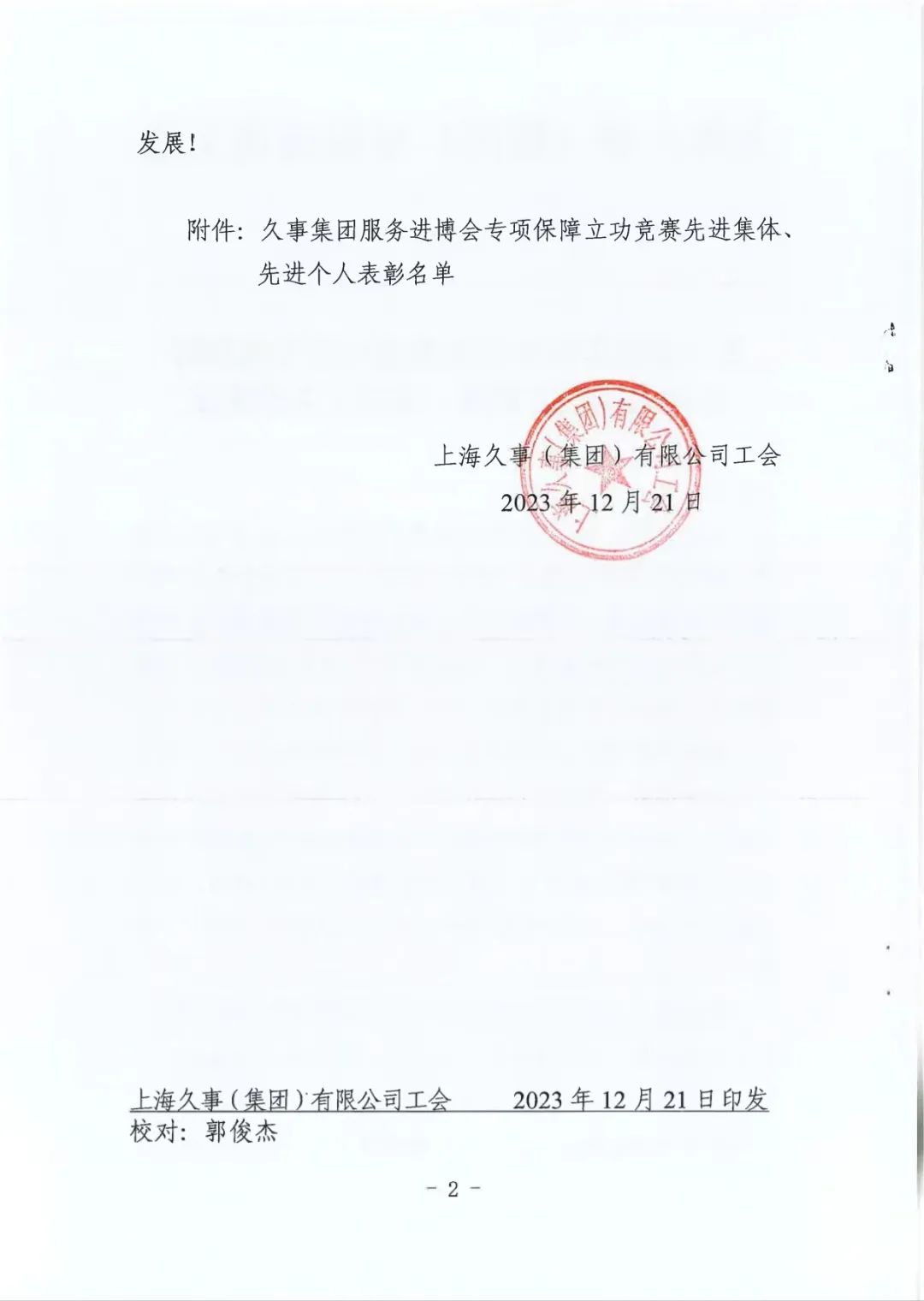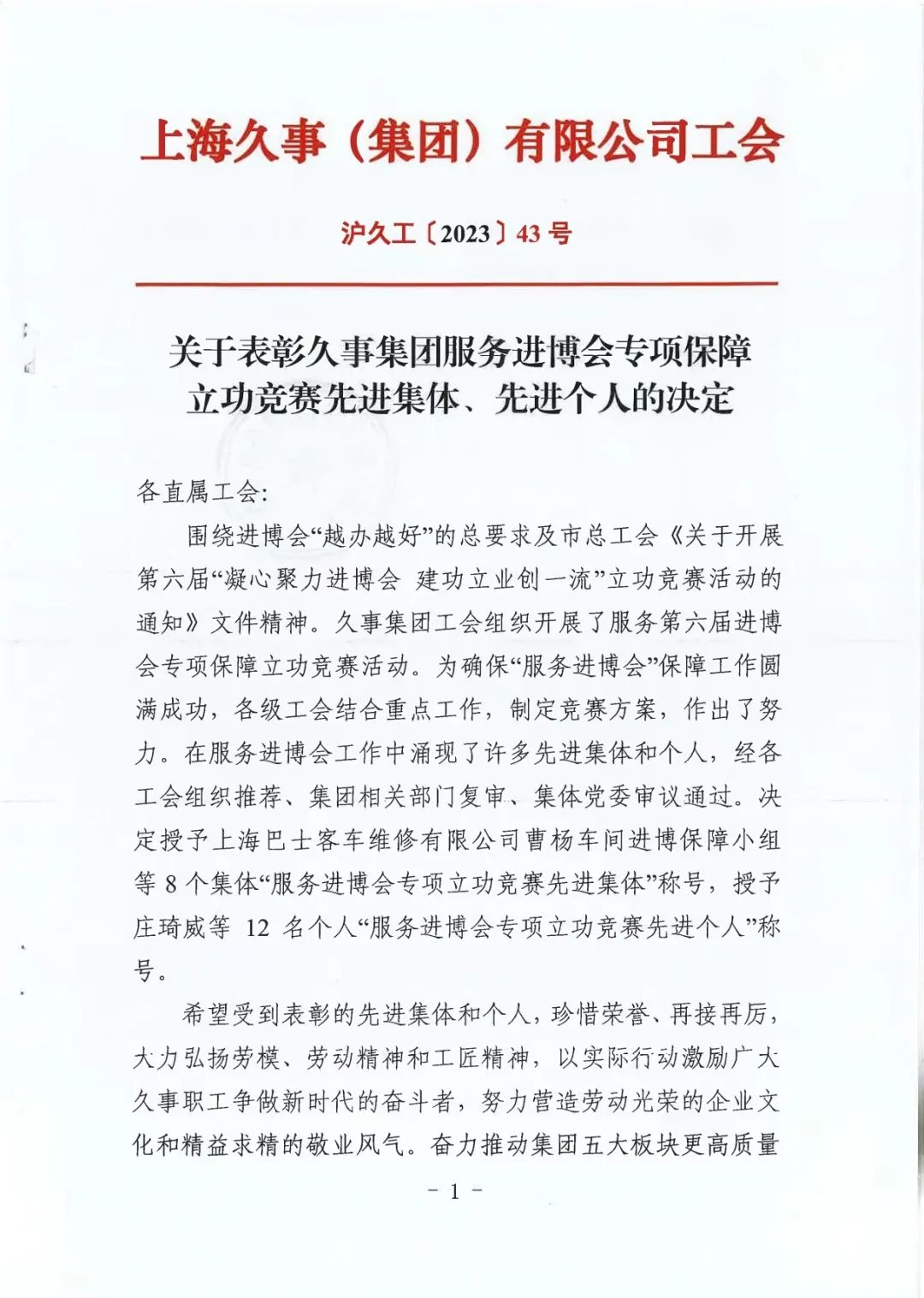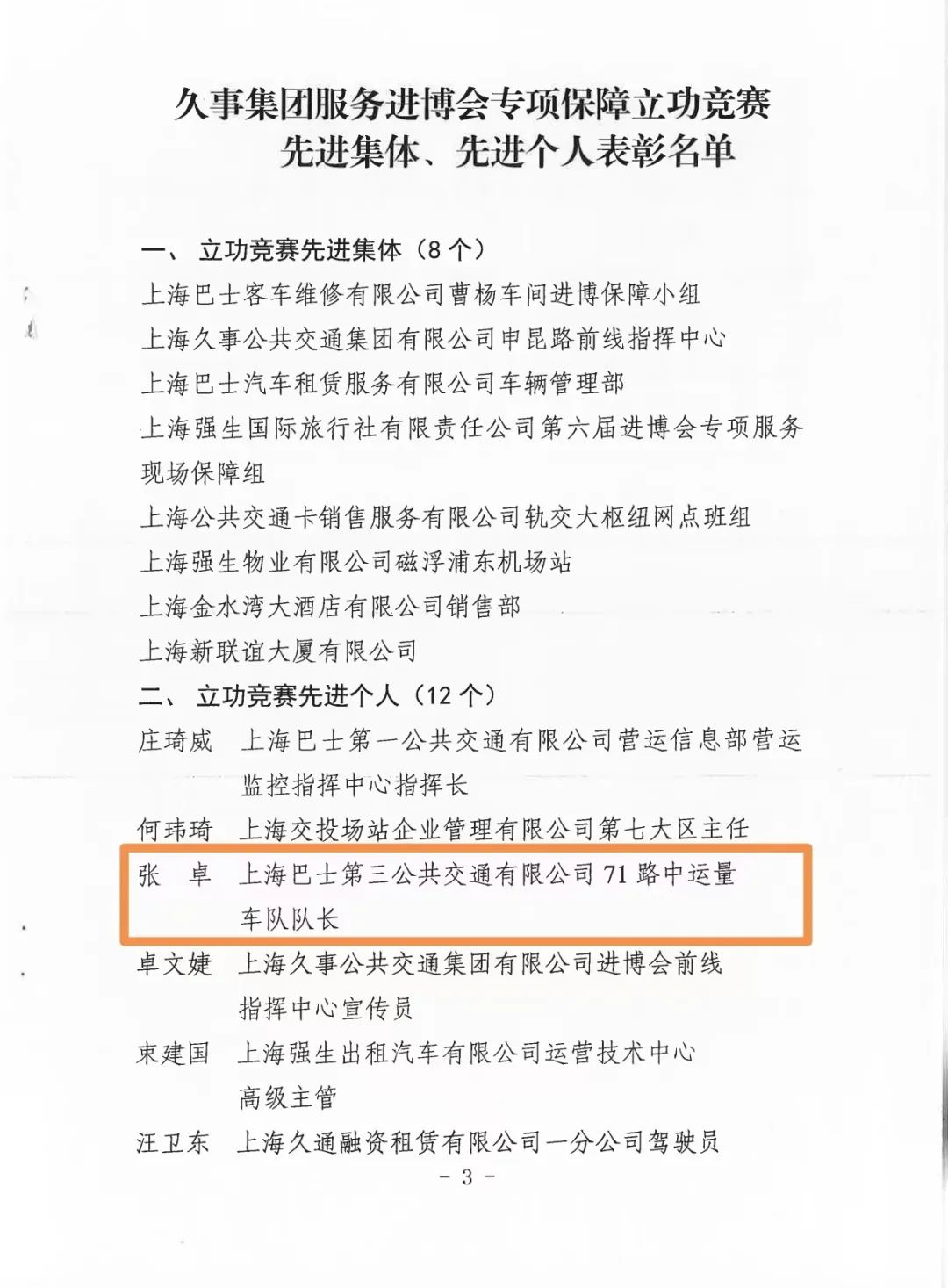 近日,上海久事(集团)有限公司工会印发《关于表彰久事集团服务进博会专项保障立功竞赛先进集体、先进个人的决定》,上海巴士第三公共交通有限公司71路中运量车队队长张卓荣获立功竞赛先进个人。