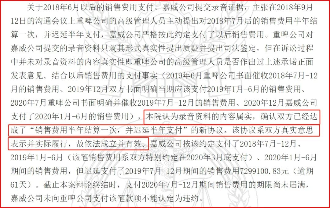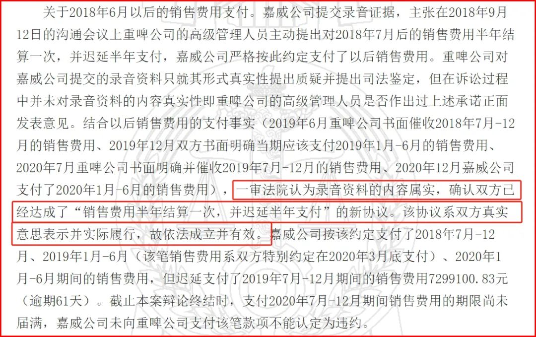 一、二审两级法院均认定双方已达成了“2018年7月后的销售费用半年结算一次,并延迟半年支付”的新约定。但是,面对已生效判决的上述认定,重庆啤酒却直接选择了予以无视,拒绝继续履行约定义务。