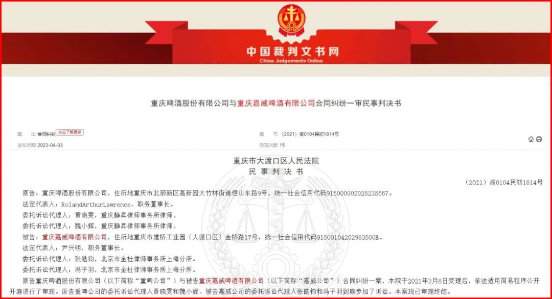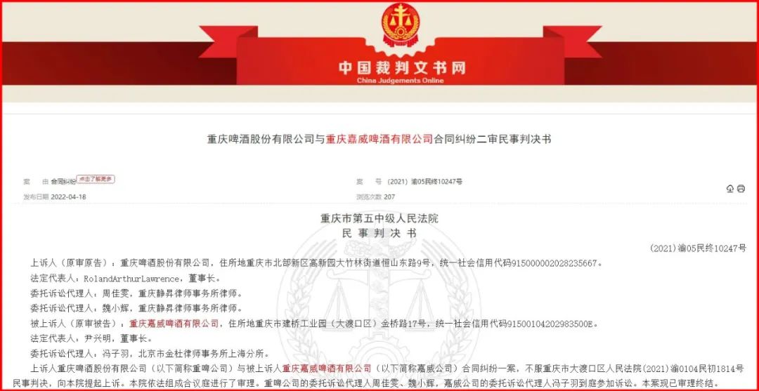 重庆啤酒不服一审判决提起上诉,重庆市第五中级人民法院经过审理后作出“驳回上诉,维持原判”的(2021)渝05民终10247号终审判决,现已生效。