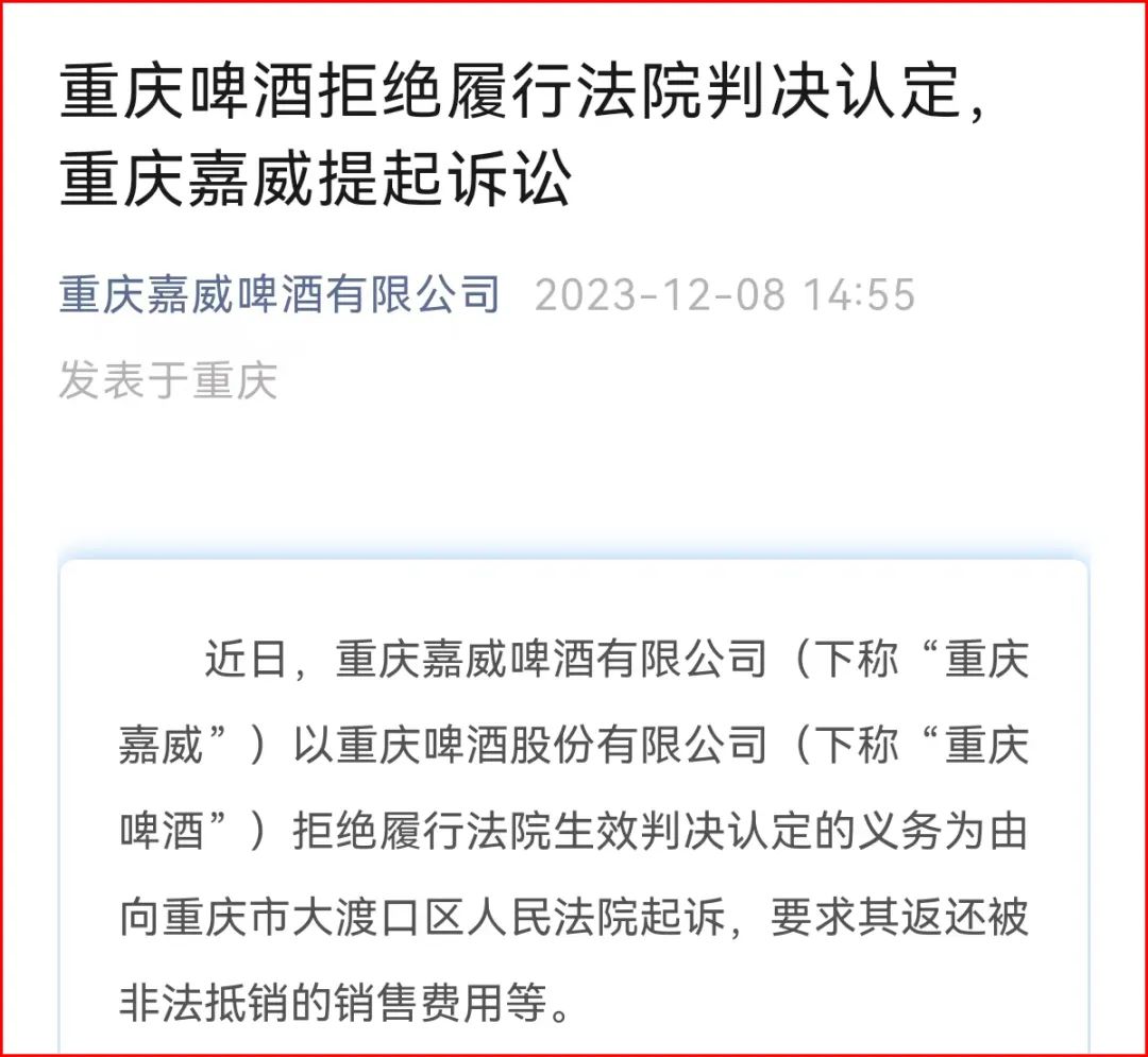 近日,重庆嘉威啤酒有限公司官方微信公众号发布消息,以拒绝履行法院生效判决认定的义务为由向重庆市大渡口区人民法院起诉重庆啤酒股份有限公司,要求其返还被非法抵销的销售费用等。