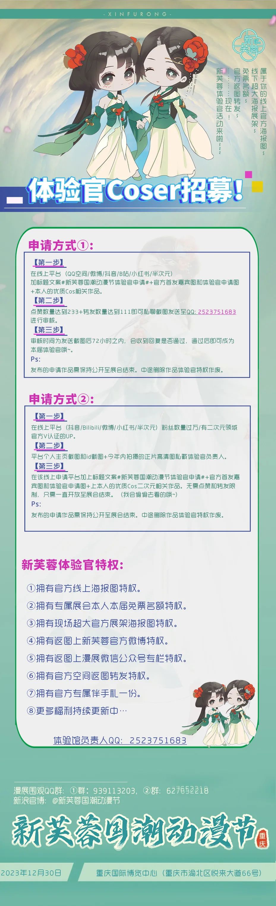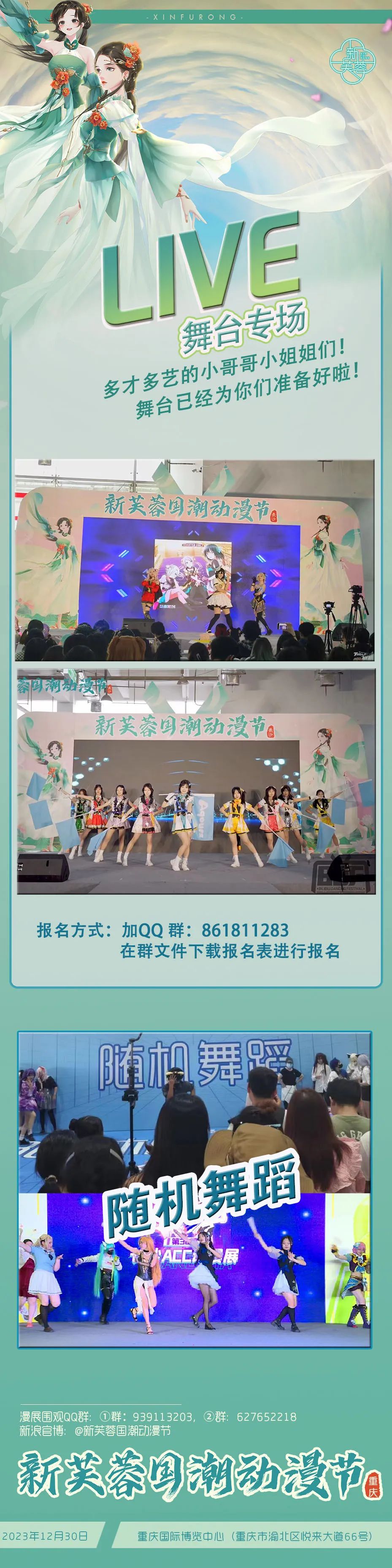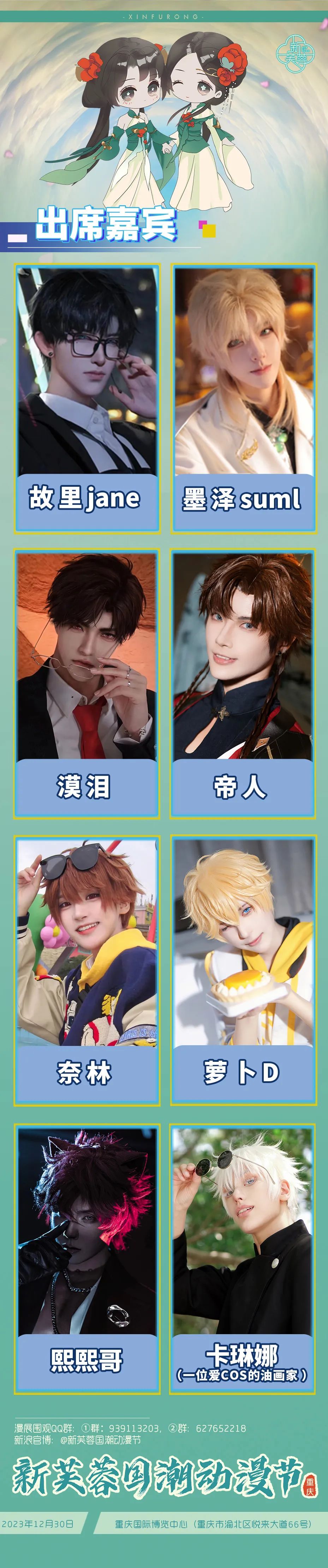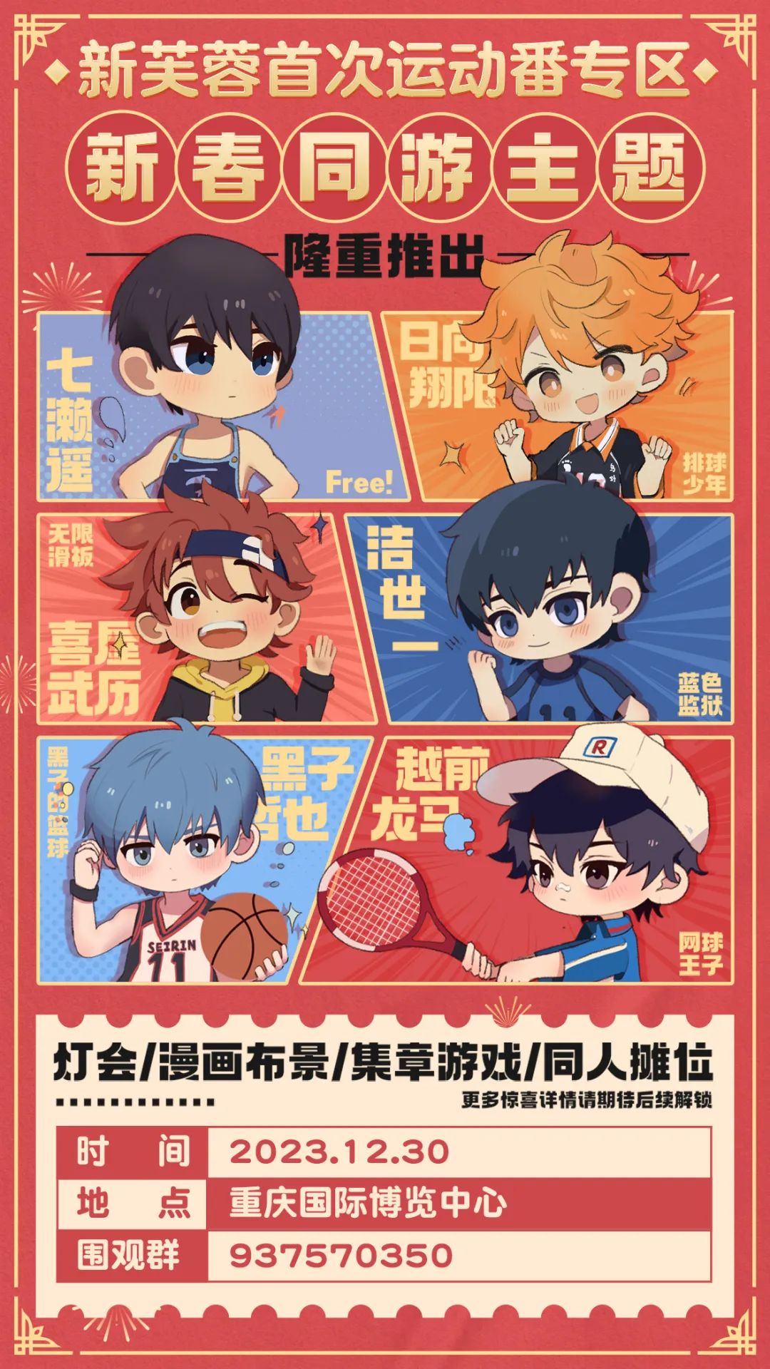 2023重庆新芙蓉国潮动漫节包含动漫原创作品贩售、动漫画展、cosplay类走秀、动漫周边摊位、互动游戏、现场活动体验、嘉宾签售及现场LIVE等精彩活动,耳熟能详的COSER将现场与国潮爱好者们近距离交流。墨泽suml、故里jane、漠泪、帝人、奈林 、萝卜D、熙熙哥……帅哥靓女轮番登场,当天下午,一位爱COS的油画家——卡琳娜将亲临现场,喜欢她的粉丝可千万不要错过哦~首届运动番新春同游主题专区开启!新春灯会、漫画布景、集章游戏……更多精彩活动一定能让你玩得不亦乐乎!爱好动漫的你