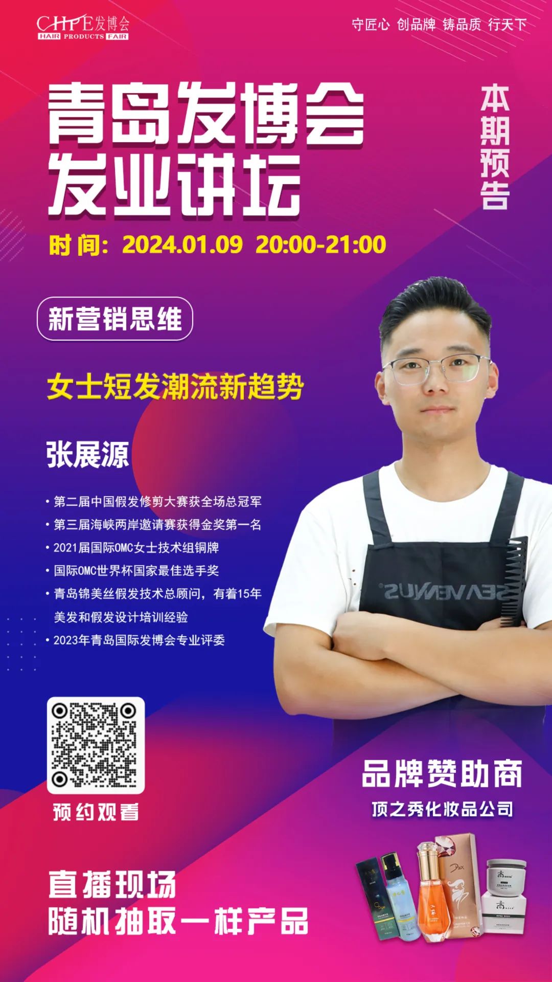 我们本期邀请了锦美丝总顾问张展源老师做客直播间,为大家分享“女士短发潮流新趋势”内容。本期内容主要是以女士潮流短发造型为主,包括发型修剪注意事项(发型结构、使用工具等)和爆款新品的介绍、修剪演示等,张展源老师本次将以技术层面进行解析,通过现场演示和讲解让大家更直观地熟悉掌握了解最新女士的短发潮流爆款。该直播活动现场福袋开福运,凡参与直播间活动的均有机会获得由顶之秀化妆品公司赞助的精美礼品一份!