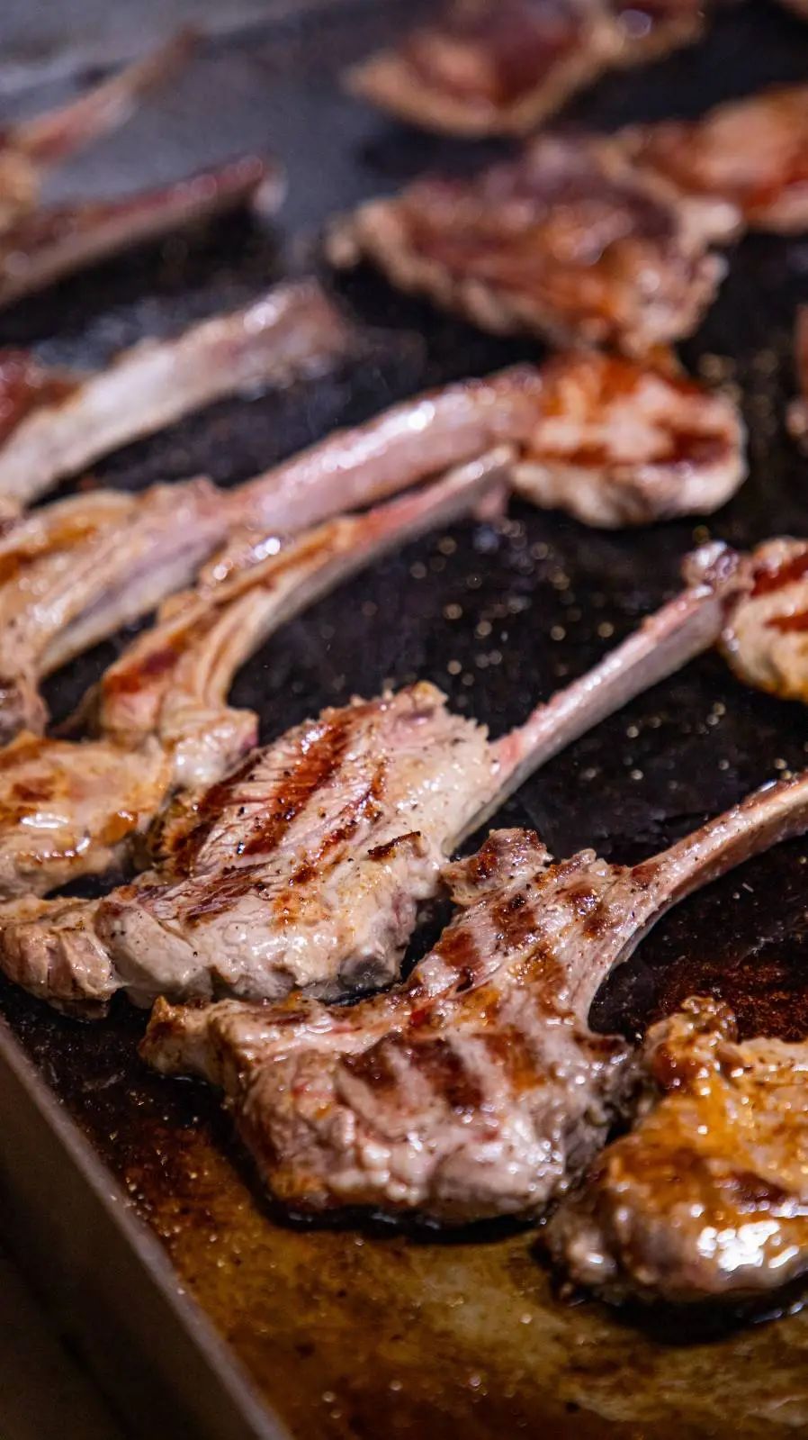 在铁板上炙烤的羊排、猪扒、秋刀鱼...