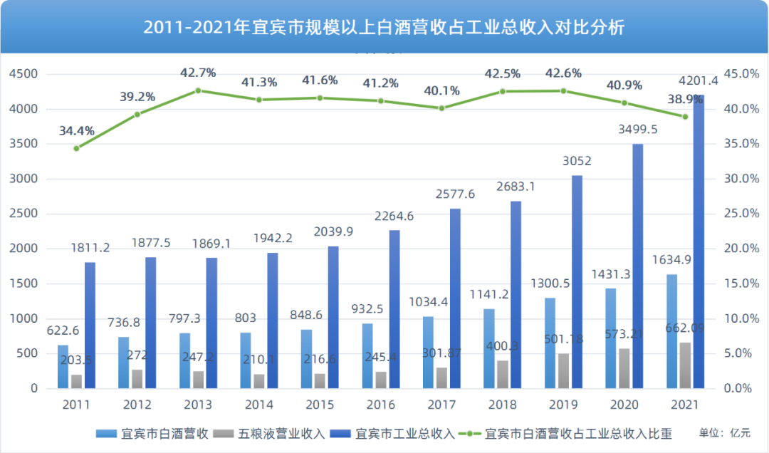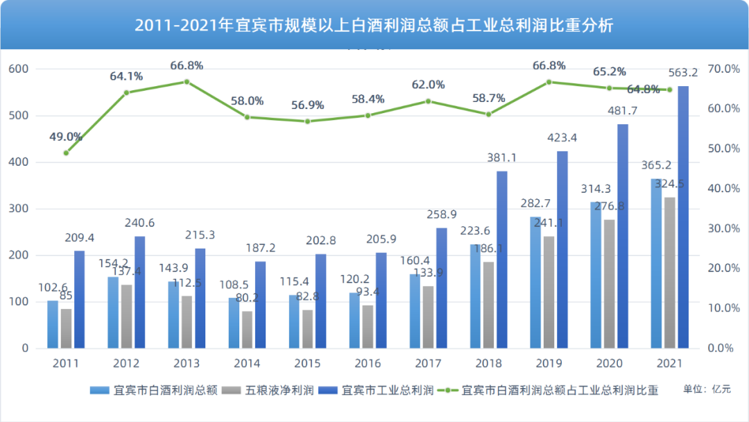 2011年五粮液净利润占宜宾市白酒利润总额比重为82.8%。2021年五粮液净利润占宜宾市白酒利润总额比重为88.9%。由此可见,五粮液对宜宾市白酒利润贡献越来越大。
